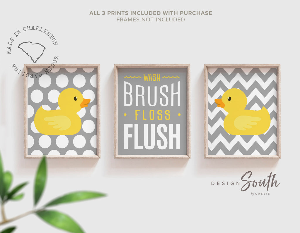 Product description: Rubber duckies with chevron and polka dot backgrounds. "Wash Brush Floss Flush" quote in yellow, white and navy blue. Other color options are available.