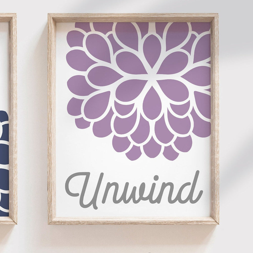 Product description: Dahlia flower with the words, "Soak. Relax. Unwind" in shades of dark periwinkle, berry and soft navy. Other color options are also available.