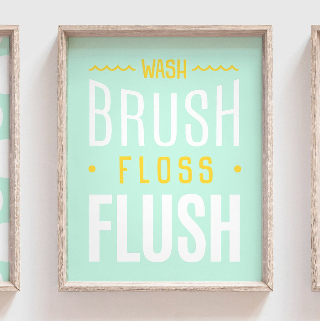 Product description: Rubber duckie bathroom prints in vibrant mint and yellow with matching print reading, "Wash Brush Floss Flush." Other options are also available in my shop.