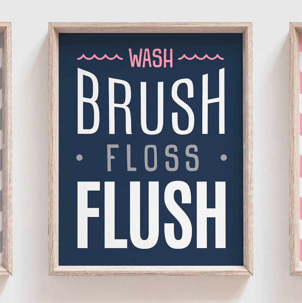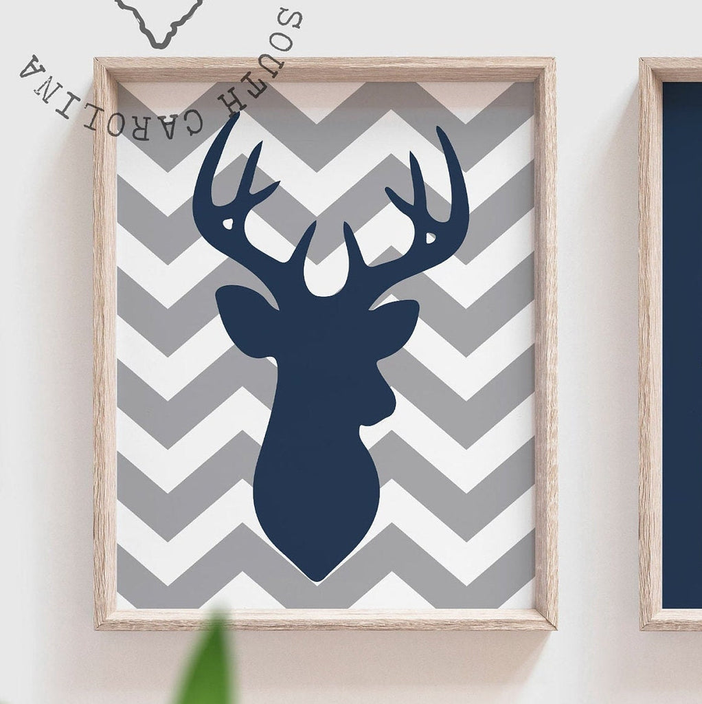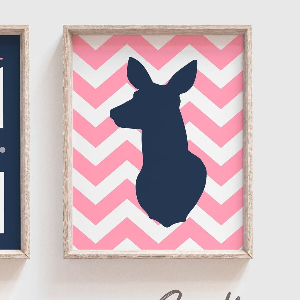 Product description: Doe and buck designs in navy blue with one smoke gray and one lollipop pink chevron background. Matching quote reading: "Wash, Brush, Floss, Flush." Other color options available.