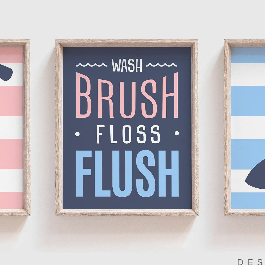 Product description: Shark designs in soft navy, baby blue and ballet pink with striped backgrounds. Matching quote reading: "Wash, Brush, Floss, Flush." Other color options available.