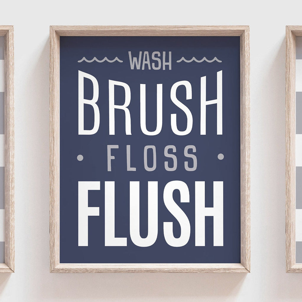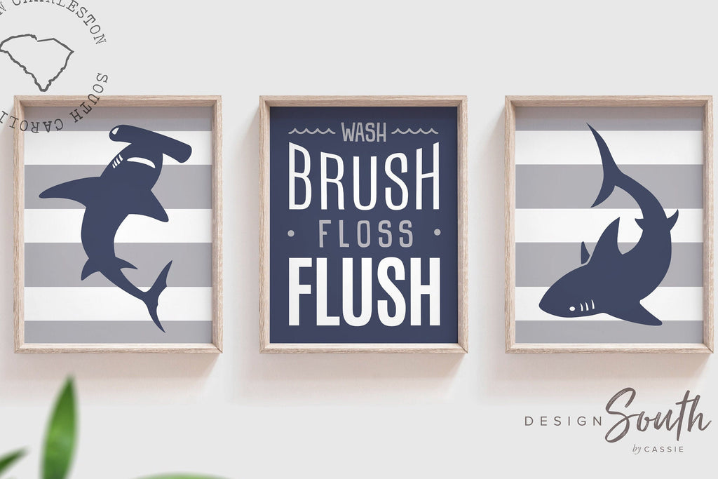 Product description: Shark designs in soft navy and smoke gray with striped backgrounds. Matching quote reading: "Wash, Brush, Floss, Flush." Other options are also available in my shop.