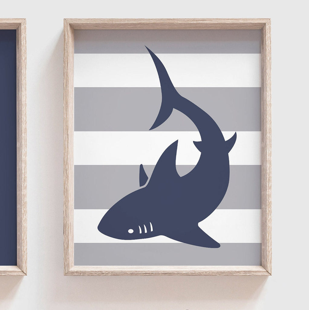 Boys gray and navy blue shark bathroom, kids bathroom sharks, boys nautical bathroom, wall shark prints for boys, ideas for toddler bathroom