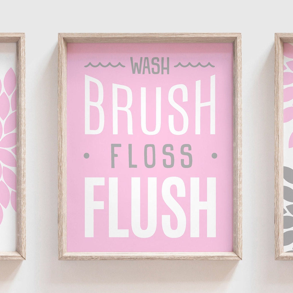 Girl pink gray bathroom decor, girls wash brush bathroom sign, gray pink girls bathroom, girls flower bathroom, modern bright kids decor