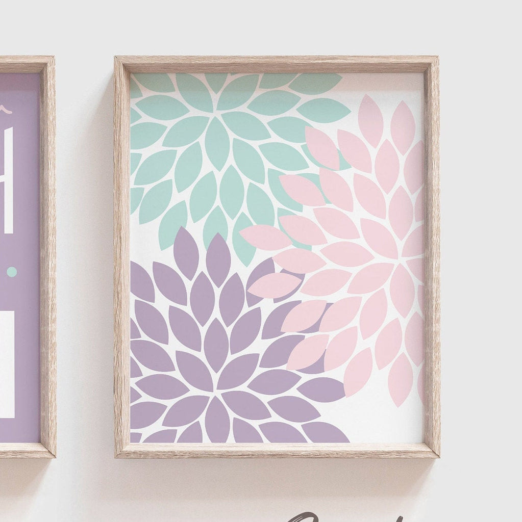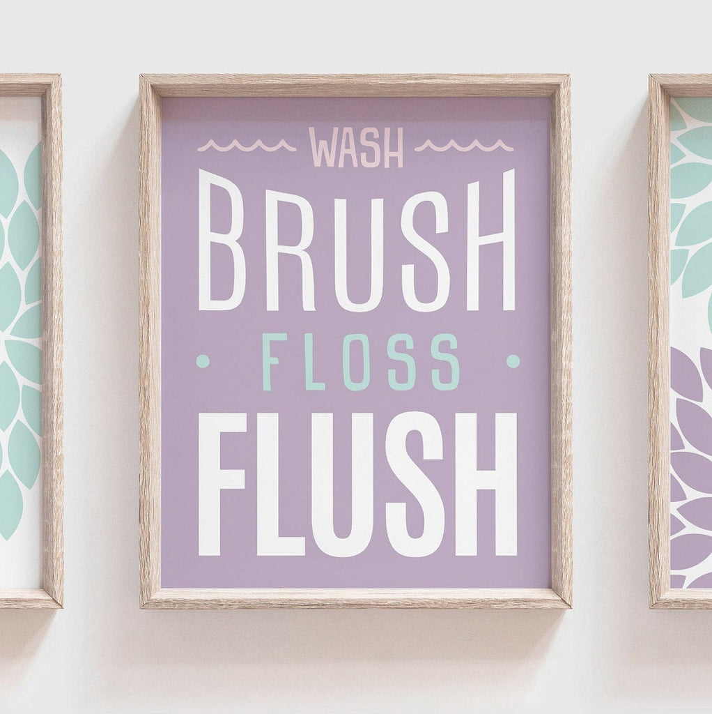 Product description: Girl's dahlia theme bathroom prints with matching print reading, "Wash Brush Floss Flush." Colors used in this listing were customized to a customer's bathroom decor, and aren't found on the color chart. Other options are also available in my shop.