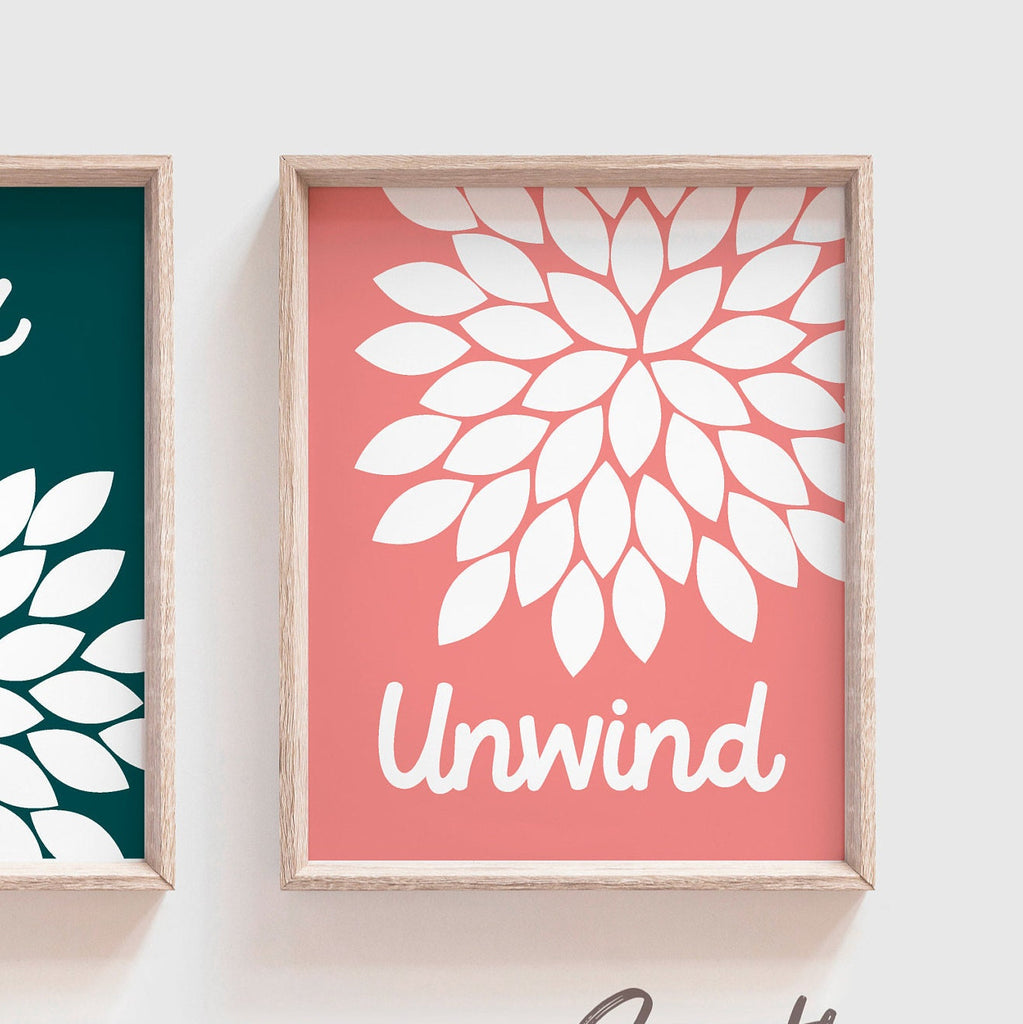 Green coral pink bathroom wall decor, soak relax unwind flower art for bathroom, adult bathroom art, childrens wall art, bathroom flower art