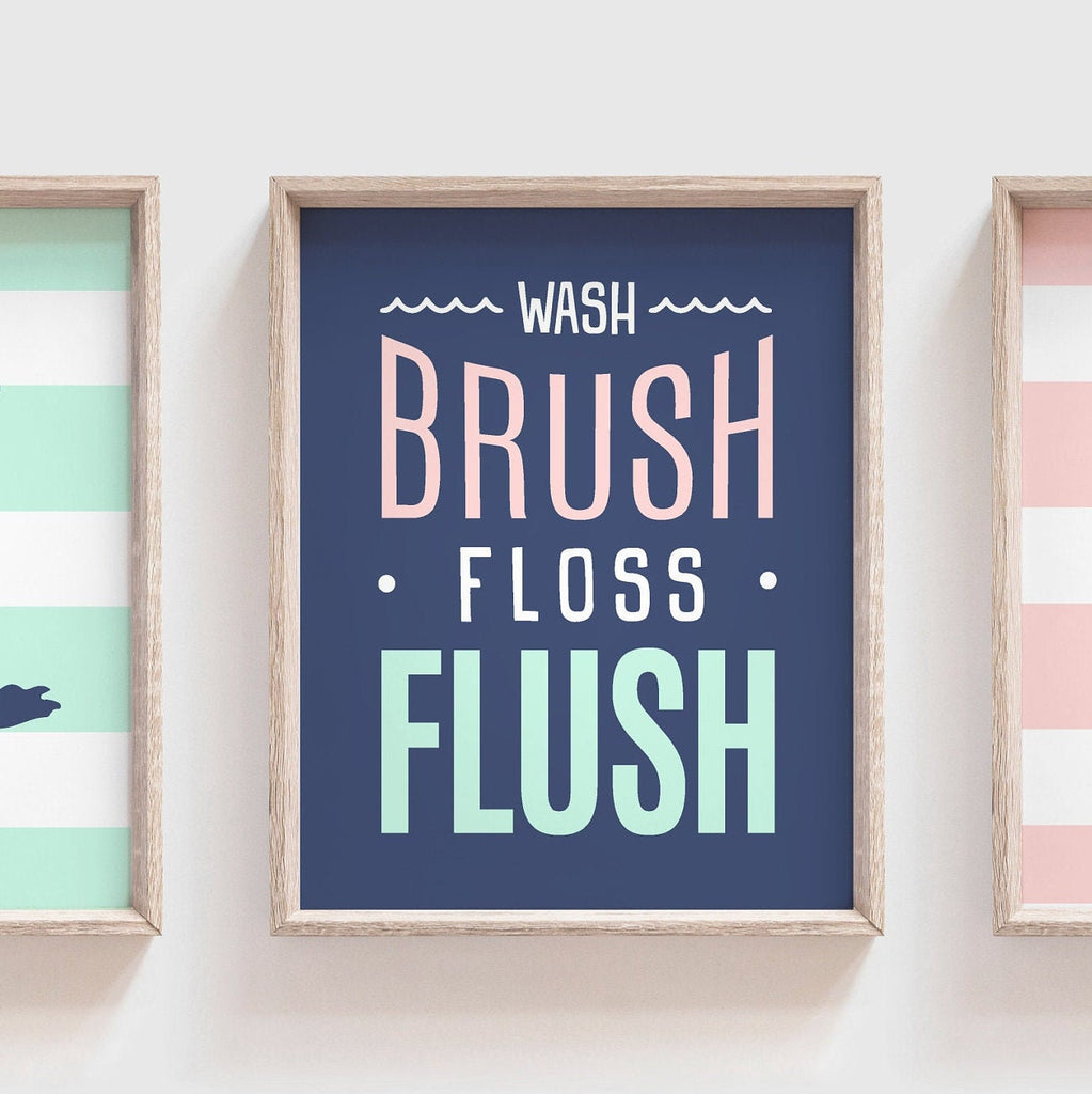 Product description: Dinosaur prints in soft navy, vibrant mint and ballet with thick striped backgrounds and matching print reading, "Wash Brush Floss Flush." Other options are also available in my shop.