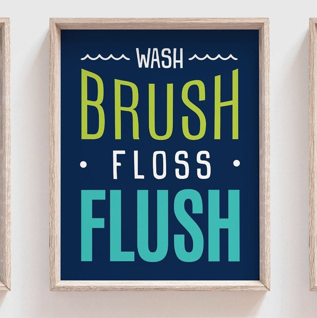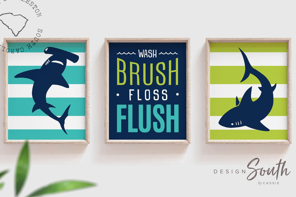 Shark bathroom decor, boys shark bathroom, boys bathroom wall art, ocean theme bathroom, shark theme bathroom, wash, brush, floss, teal lime