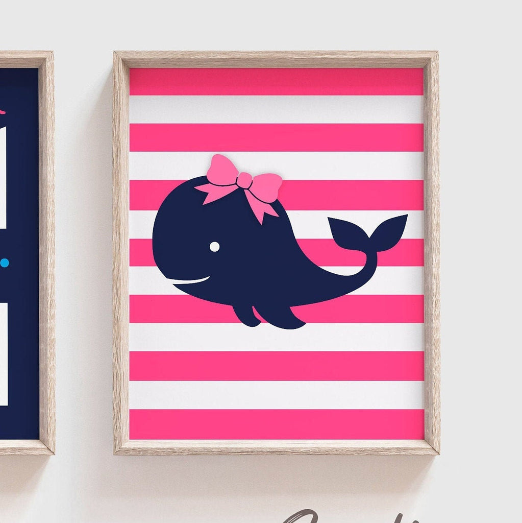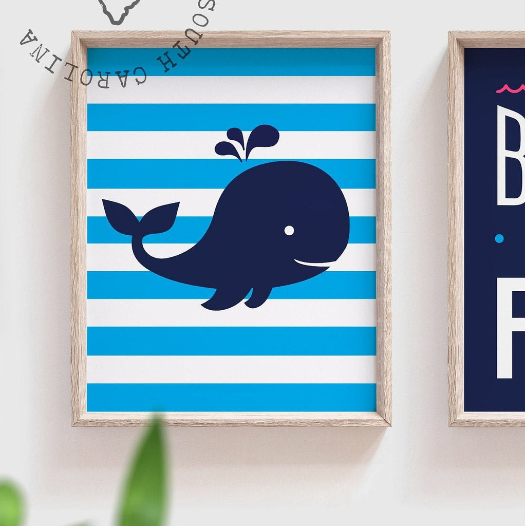 Product description: Whale designs in navy blue, cyan blue and princess pink with striped backgrounds. One whale is accented with a pink hair bow. Matching quote reading: "Wash, Brush, Floss, Flush." Other color options available.