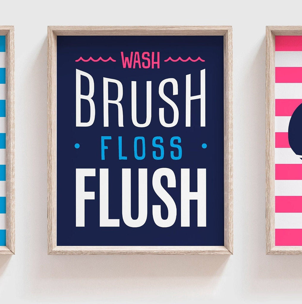 Twin bathroom art, baby's bathroom, wash, brush, floss, flush, hot pink, blue, navy, boy girl bathroom, boys and girls bathroom, twins