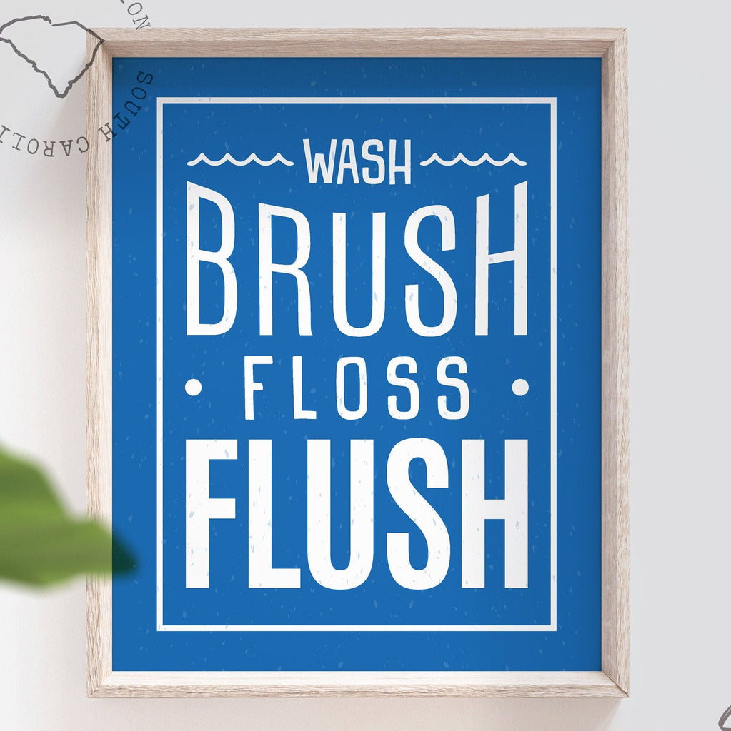 Product description: Bathroom print in atlantic reading, "Wash. Brush. Floss. Flush." Other options are also available in my shop.