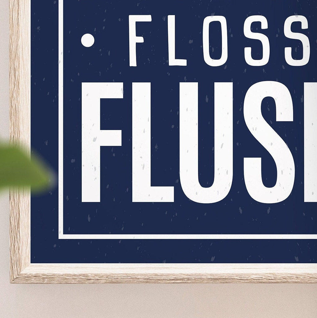 Wash, Brush, Floss, Flush, bathroom print in navy and white, bathroom print for children, navy bathroom print for boys or girls, white navy