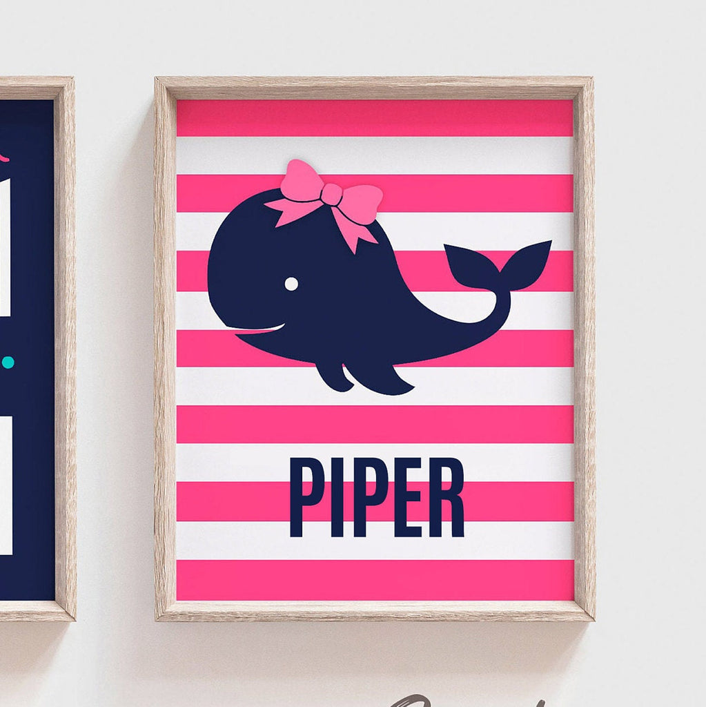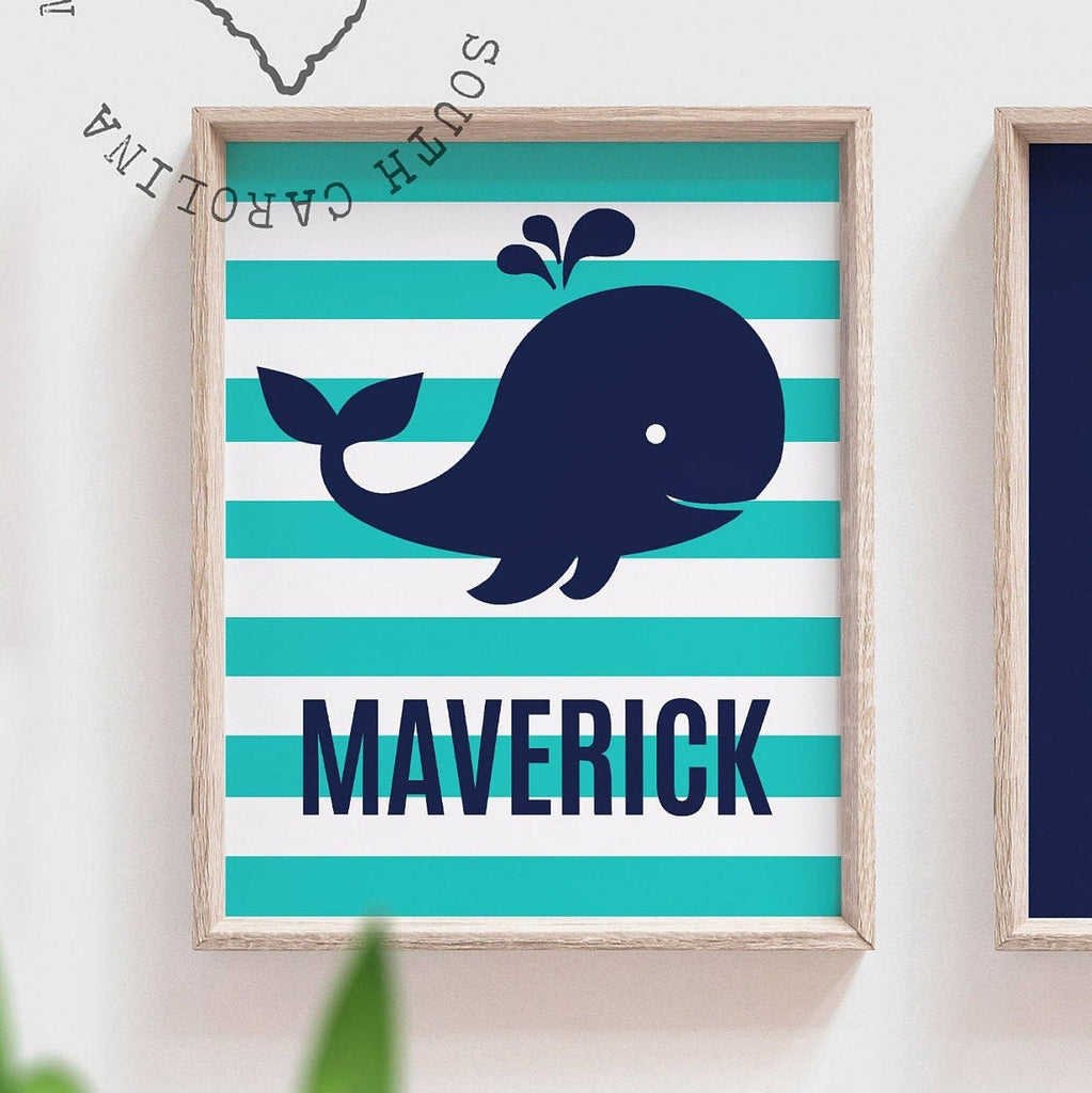 Product description: Whale theme prints in baja, navy blue and princess with striped backgrounds. Whales feature personalization to be customized with your children's names. Other options are also available in my shop.