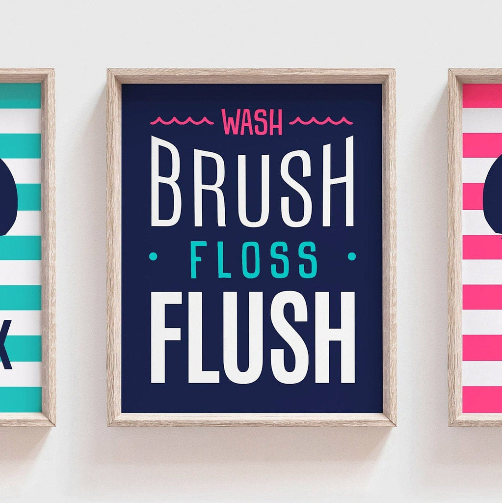 Whale bathroom decor, kids whale bathroom, twin whale bathroom, boy/girl bathroom prints, teal and hot pink, wash brush flush floss bathroom