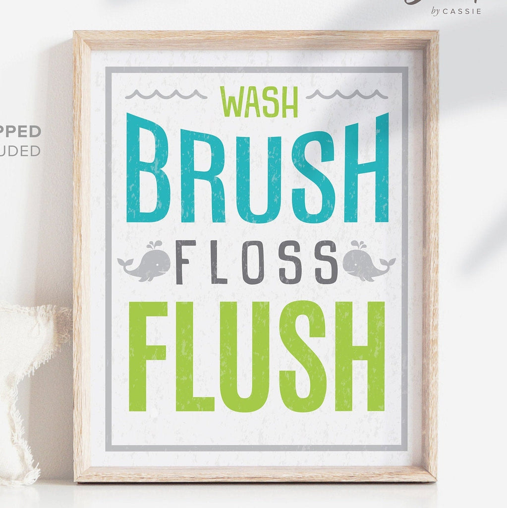 Whale bathroom decor, wash, brush, floss, flush, bathroom print, child's bathroom decor, whale theme, bathroom quote, whale bathroom art