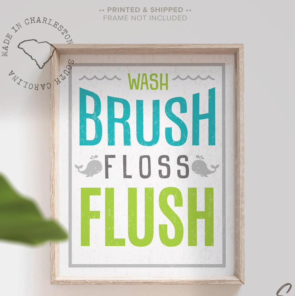 Product description: Bathroom print in baja, margarita, charcoal and smoke accented with whales reading, "Wash. Brush. Floss. Flush." Other options are also available in my shop.