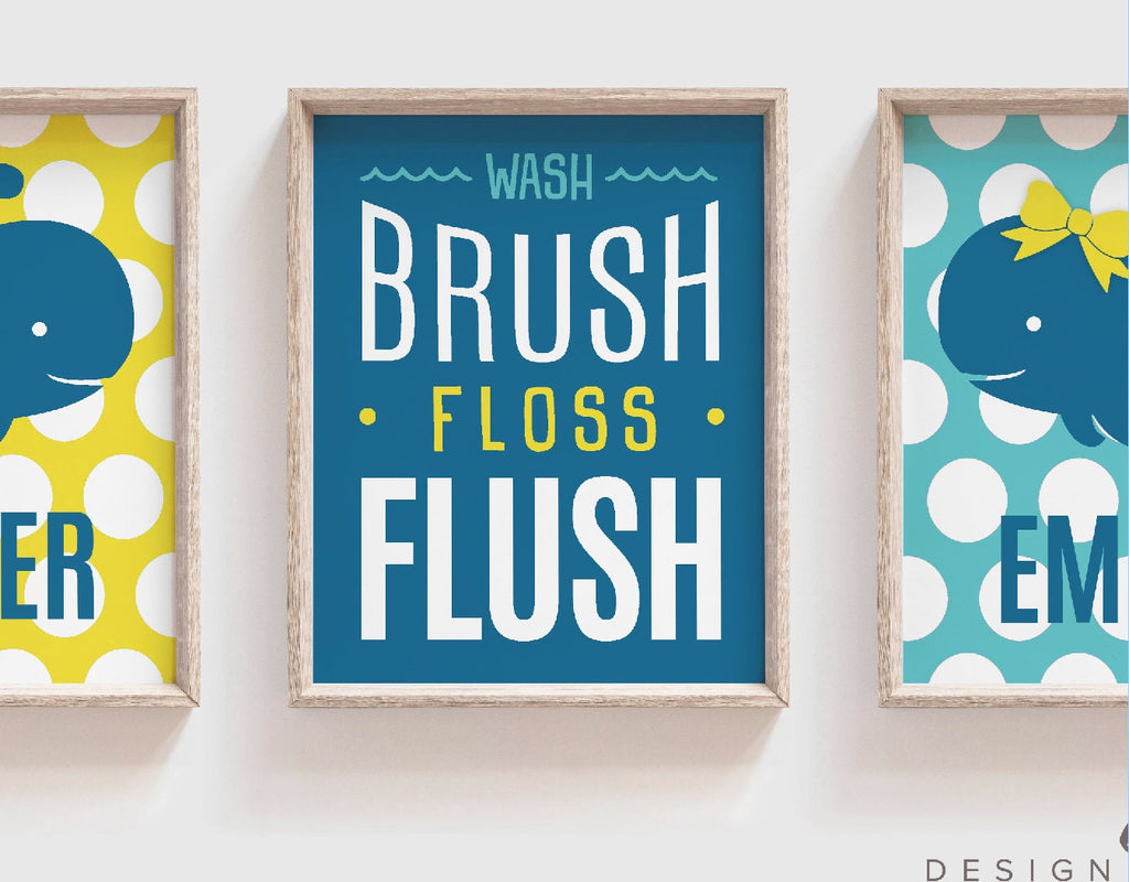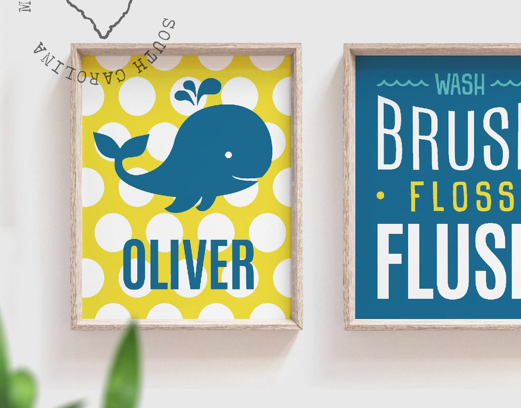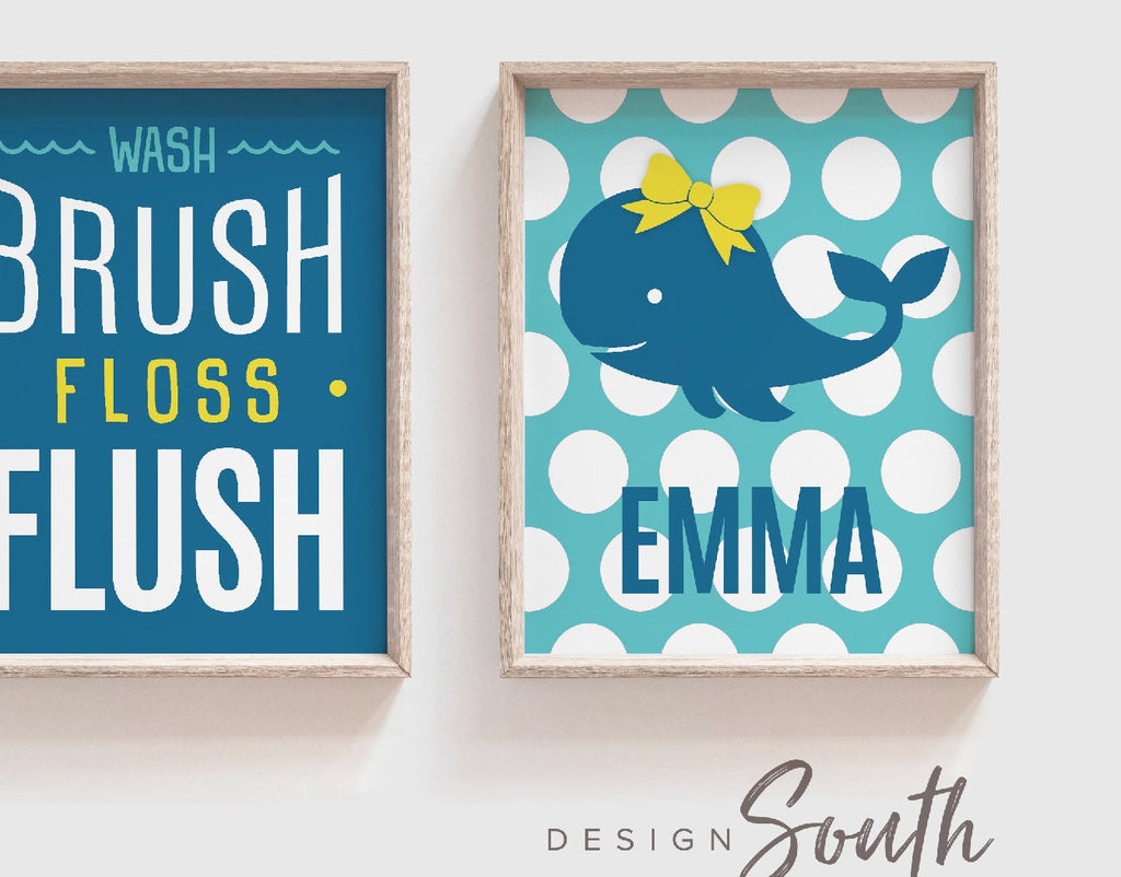 Product description: Whale designs in lemon yellow, robin egg and gentian blue with polka dot backgrounds. One whale is accented with a hair bow. Matching quote reading: "Wash, Brush, Floss, Flush." Other color options available. Bow can be removed or added upon request.