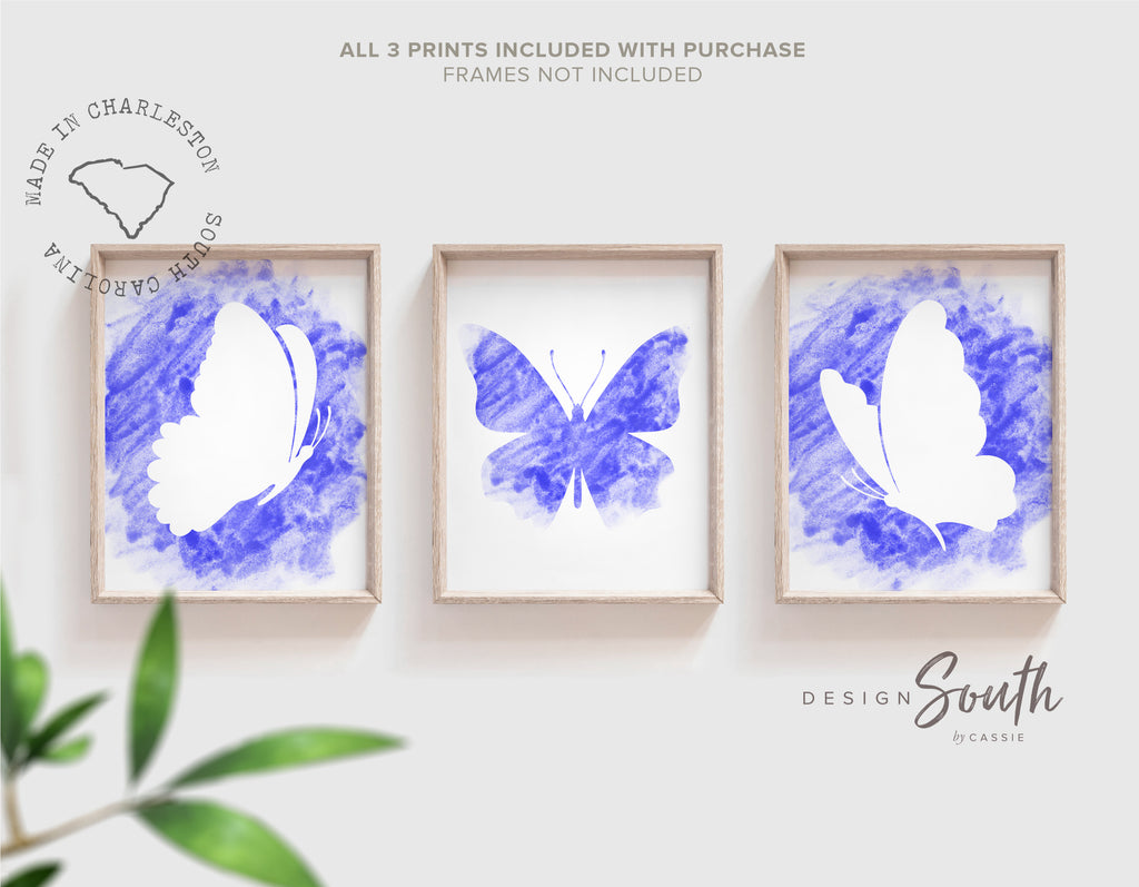 Blue butterfly art, art posters set of three watercolor blue butterflies, beautiful flying butterfly art, blue indigo girl's art butterflies