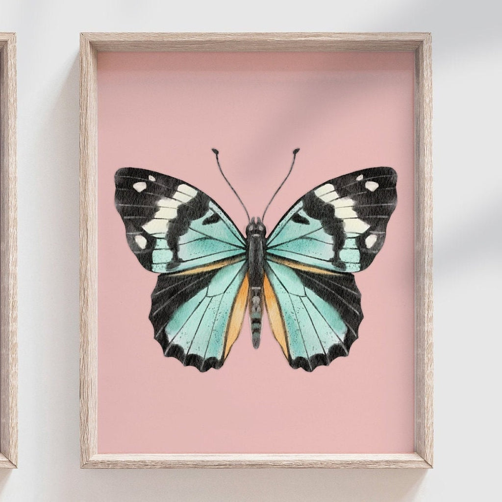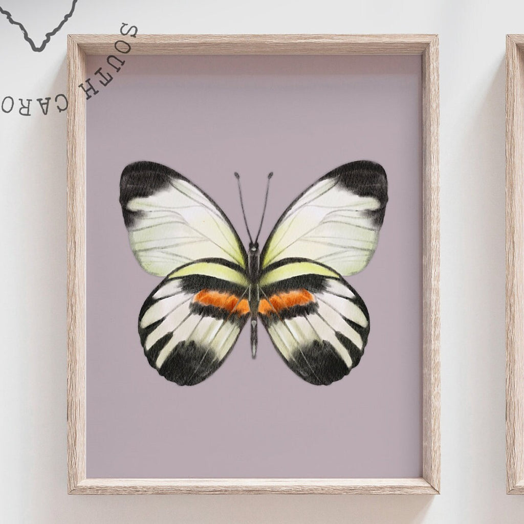 Product description: Watercolor illustrated butterfly prints with solid pastel colored backgrounds. Other options are also available in my shop.