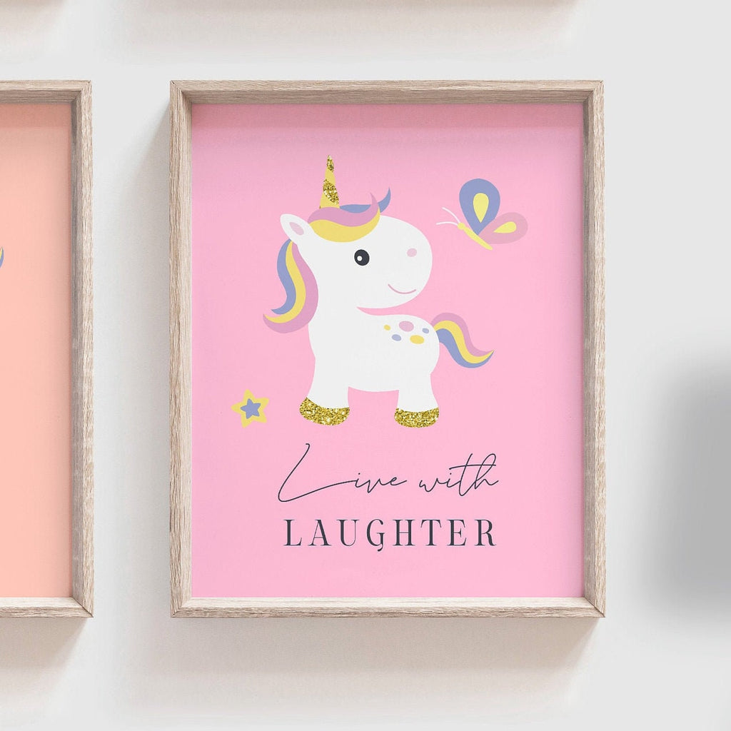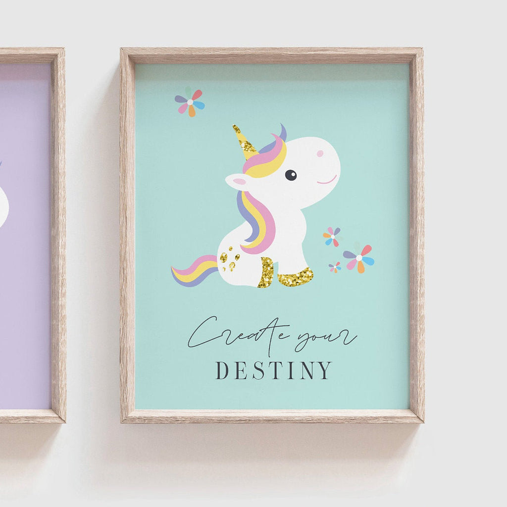 Product description: Unicorn designs with gold sparkle accents and background colors in lollipop, peach, aqua and lavender. Inspirational quotes read, "Believe in yourself... Create your destiny... Follow your dreams... Live with laughter." Other options are also available in my shop. Note: The item listed is created digitally. High resolution photography of sparkles was used to create a 3D appearance of sparkles.