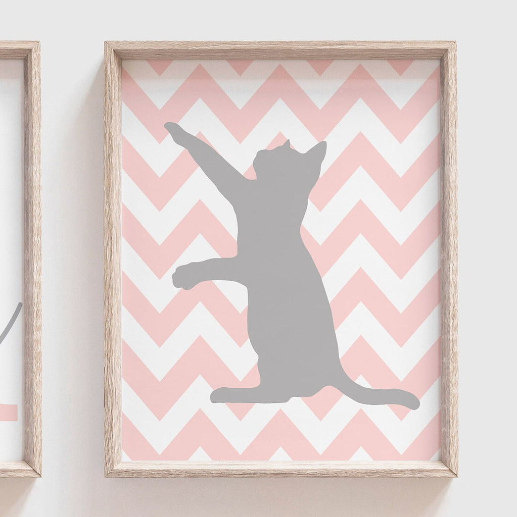 Baby girl nursery pink gray, kitty cat art prints, kitten theme, gift for little girl birthday, personalized nursery wall decor, cat decor