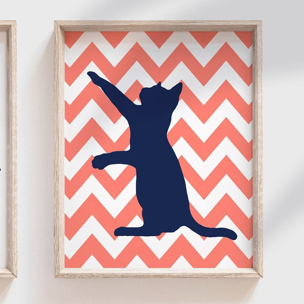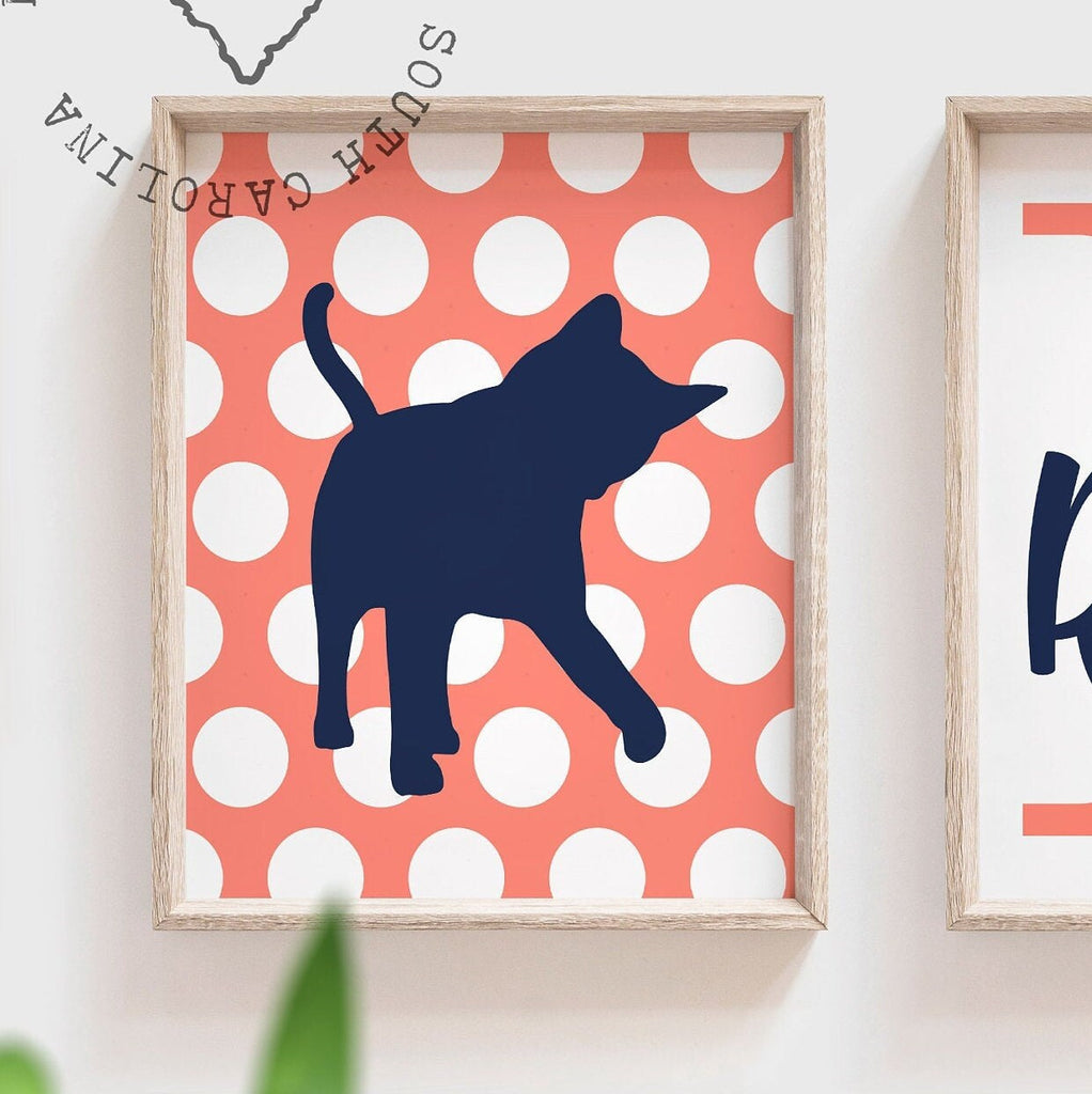 Coral and navy blue nursery cat kitten theme, kitten bedroom wall art for girls, coral kitten art, cat birthday gift for girl, cat art print
