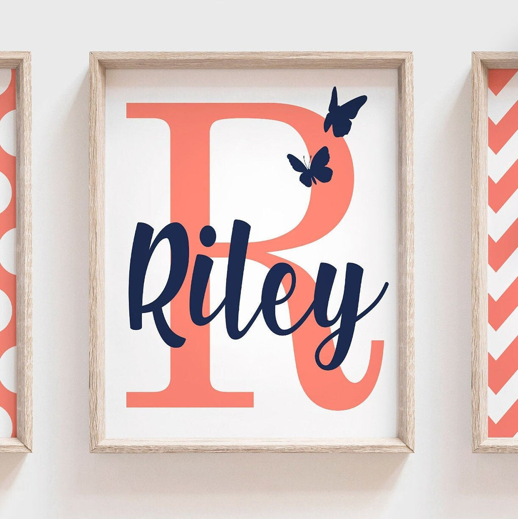 Product description: Kitten theme prints in navy blue and coral accented with butterflies and matching monogram print. Other options are also available in my shop.