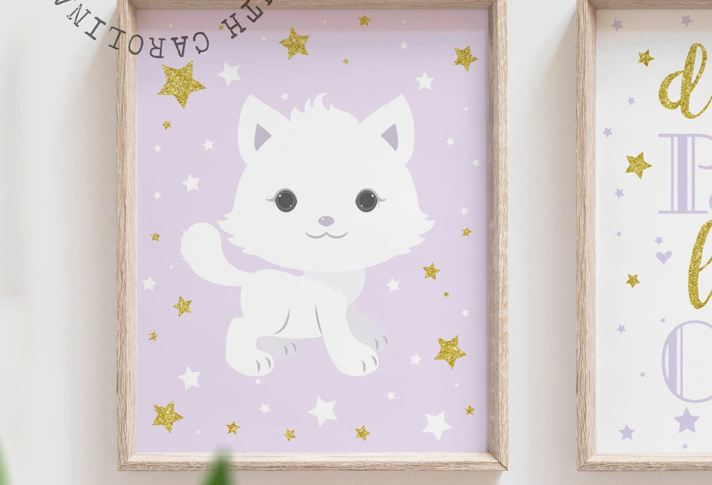 Product description: Kitten theme prints in lilac and gold sparkle accented with stars and matching inspirational print reading, "Dream big little one." Other options are also available in my shop.
