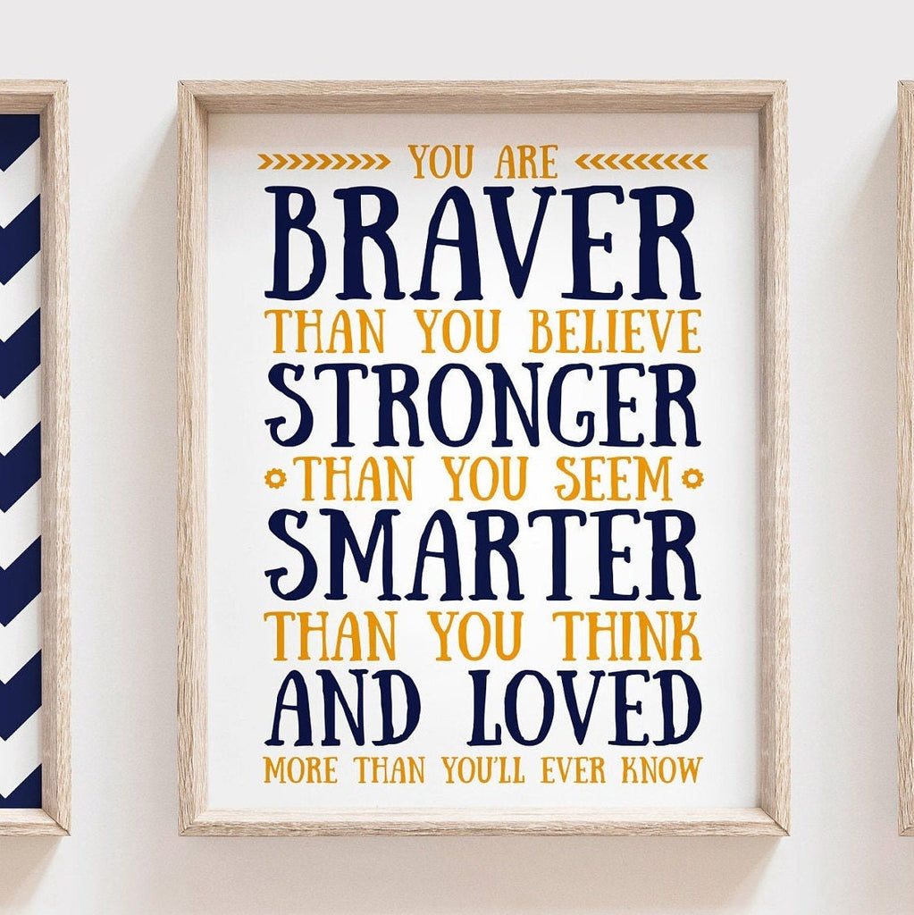 Product description: Construction trucks in navy blue and saffron with chevron and polka dot backgrounds and matching inspirational quote reading, You are braver than you believe, stronger than you seem, smarter than you think, and love more than you'll ever know." Other options are also available in my shop.