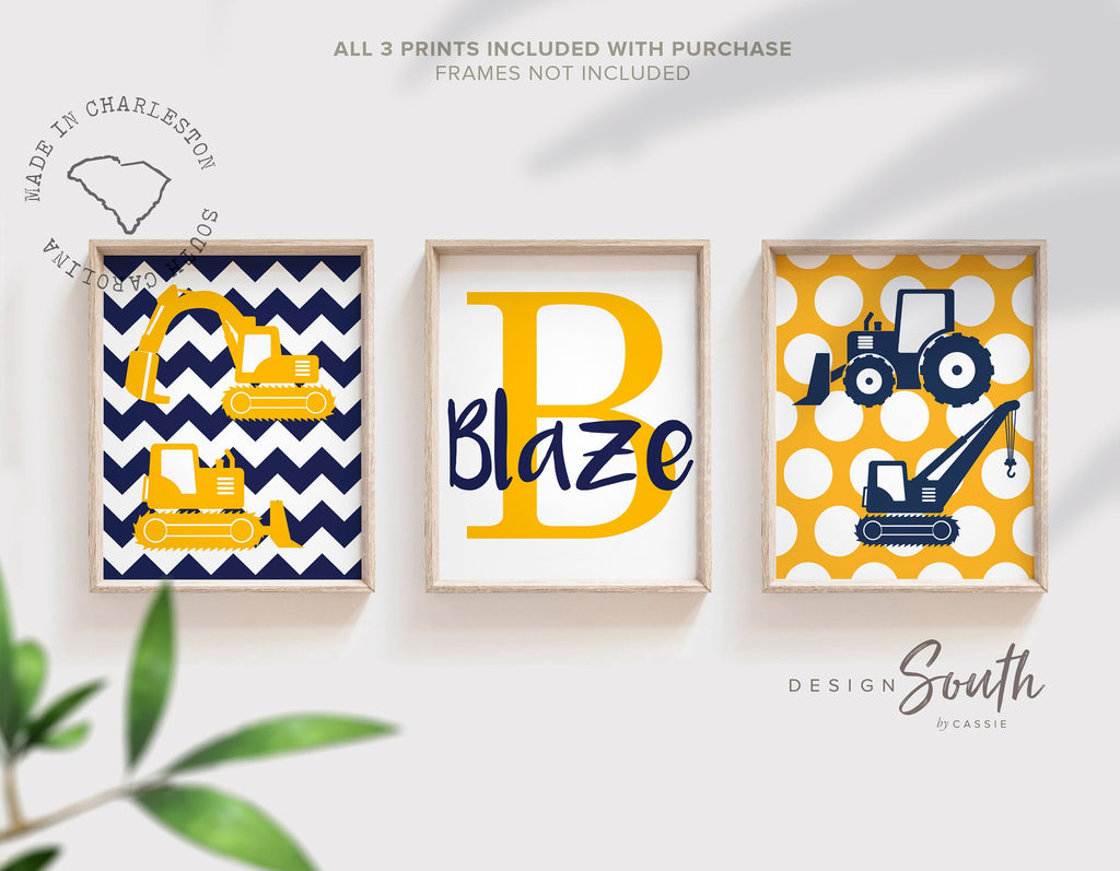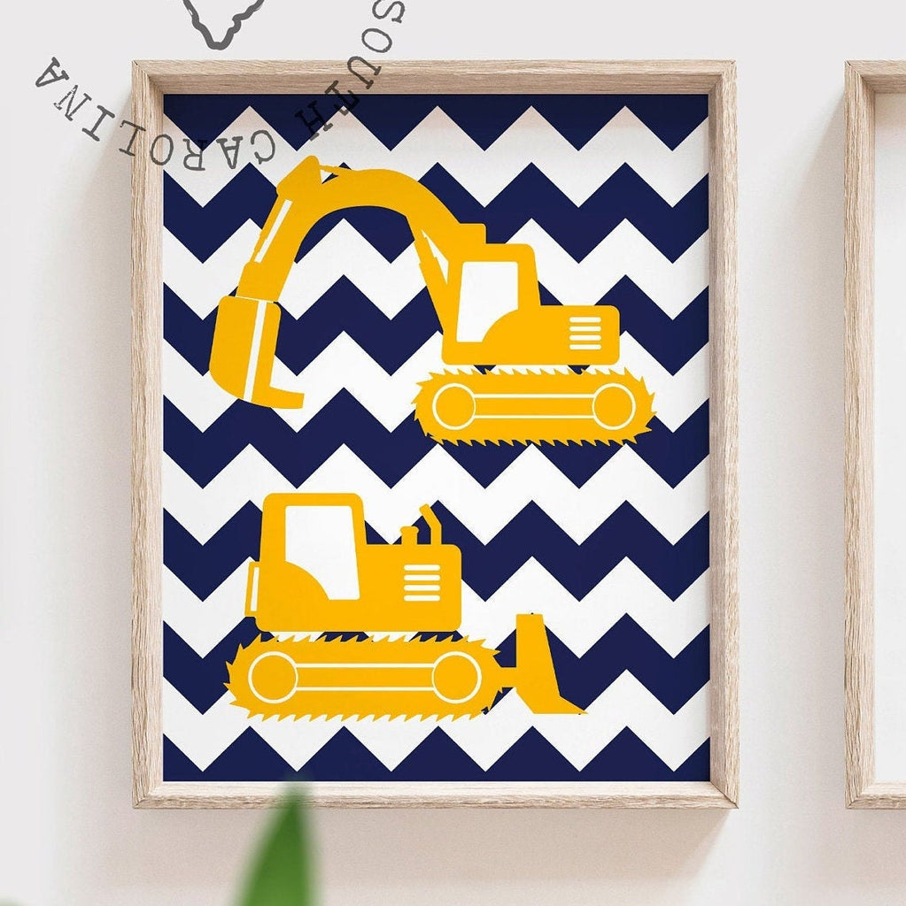 Bedroom construction wall art posters boy, toddler room yellow navy blue construction theme, kid room decor digger trucks construction quote