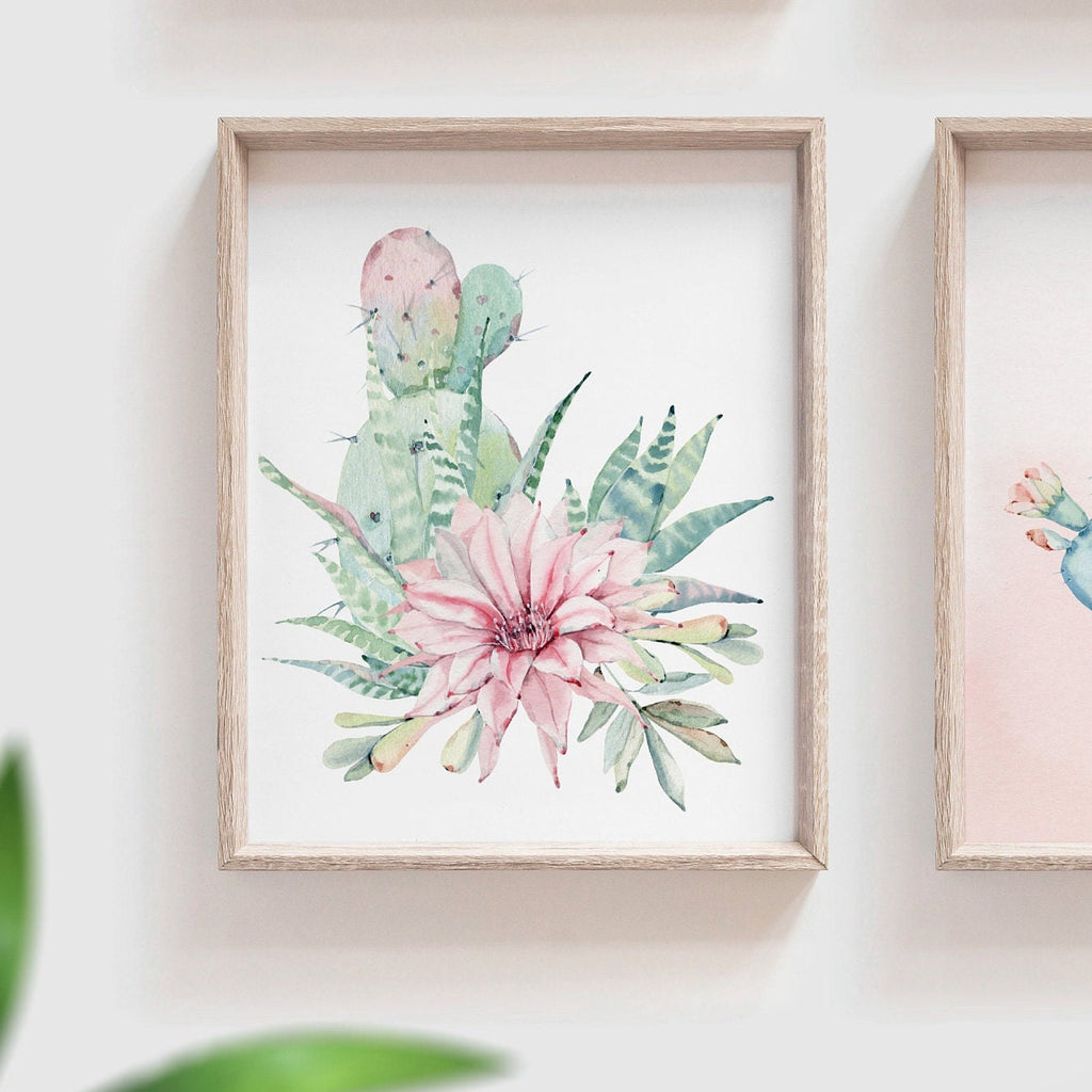 Baby girl boho cactus nursery, walls pink floral cactus prints, set of 4 flower prints, desert theme cactus bloom art, nursery succulents