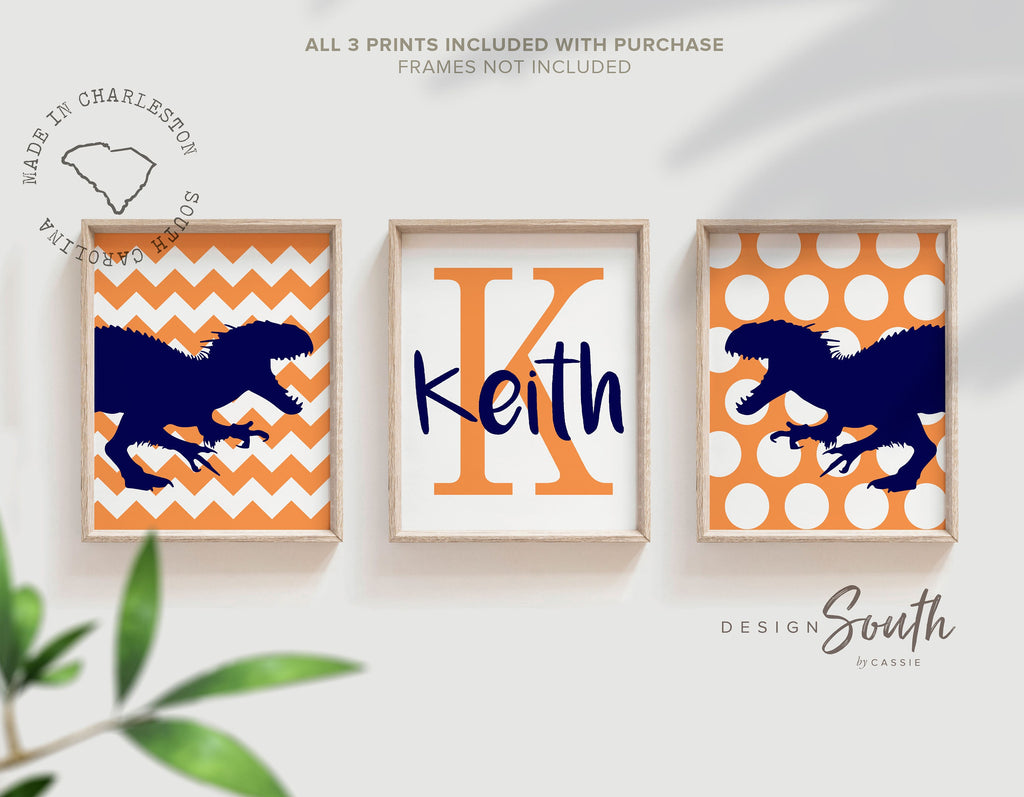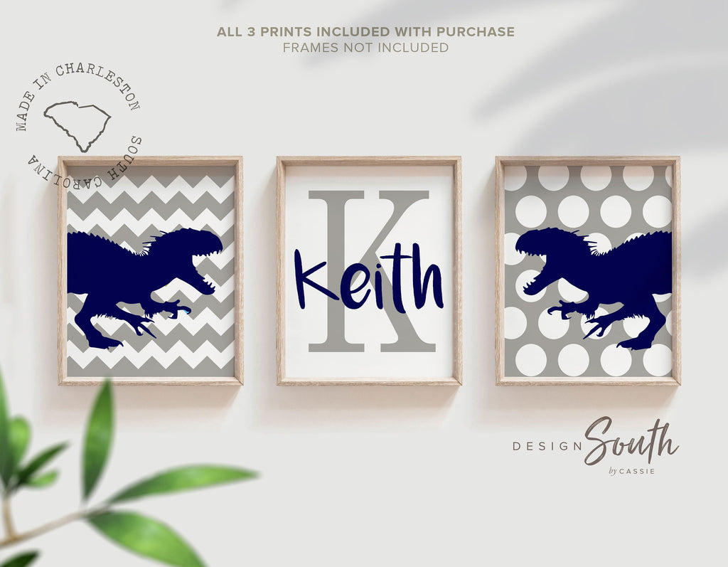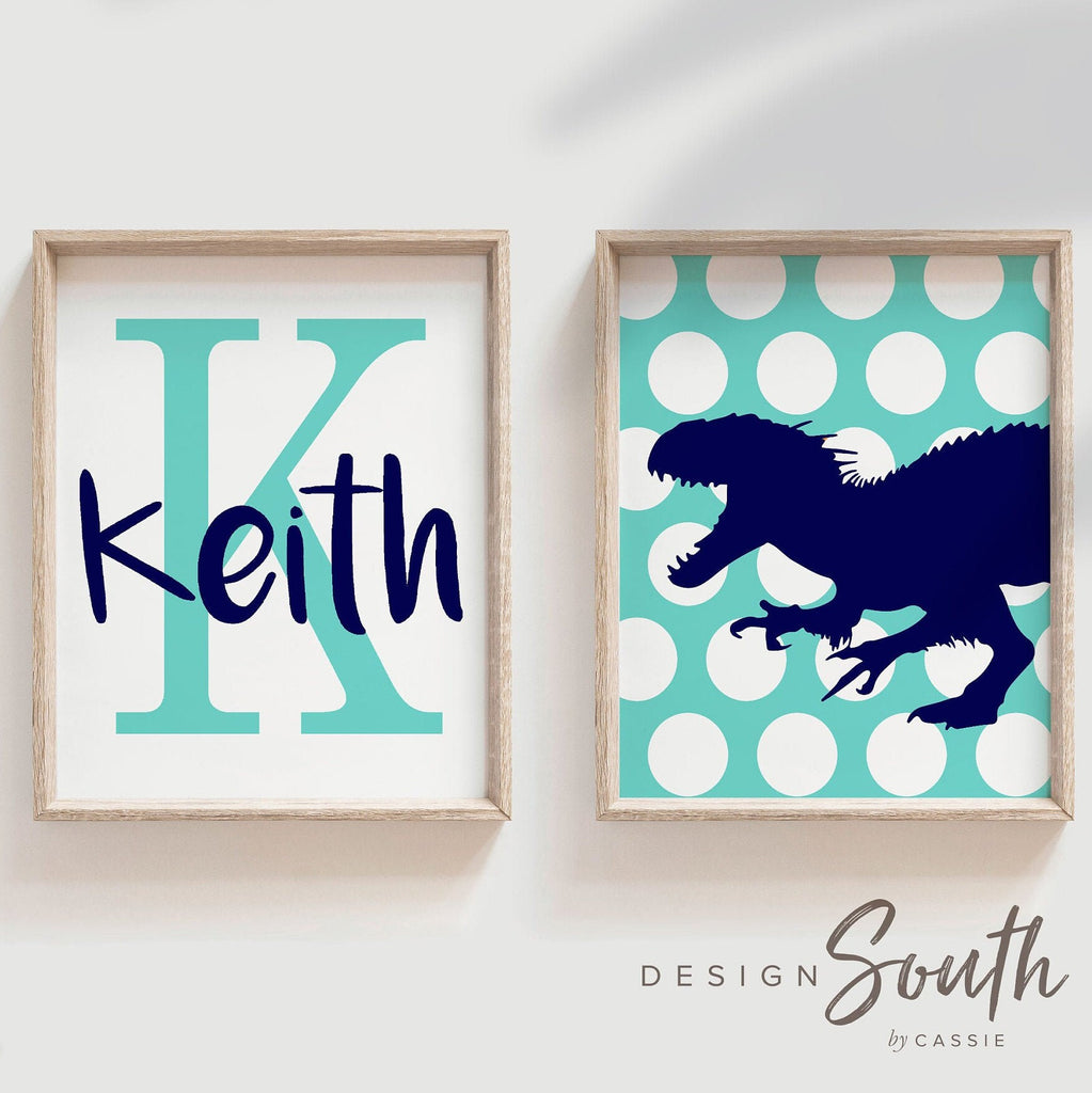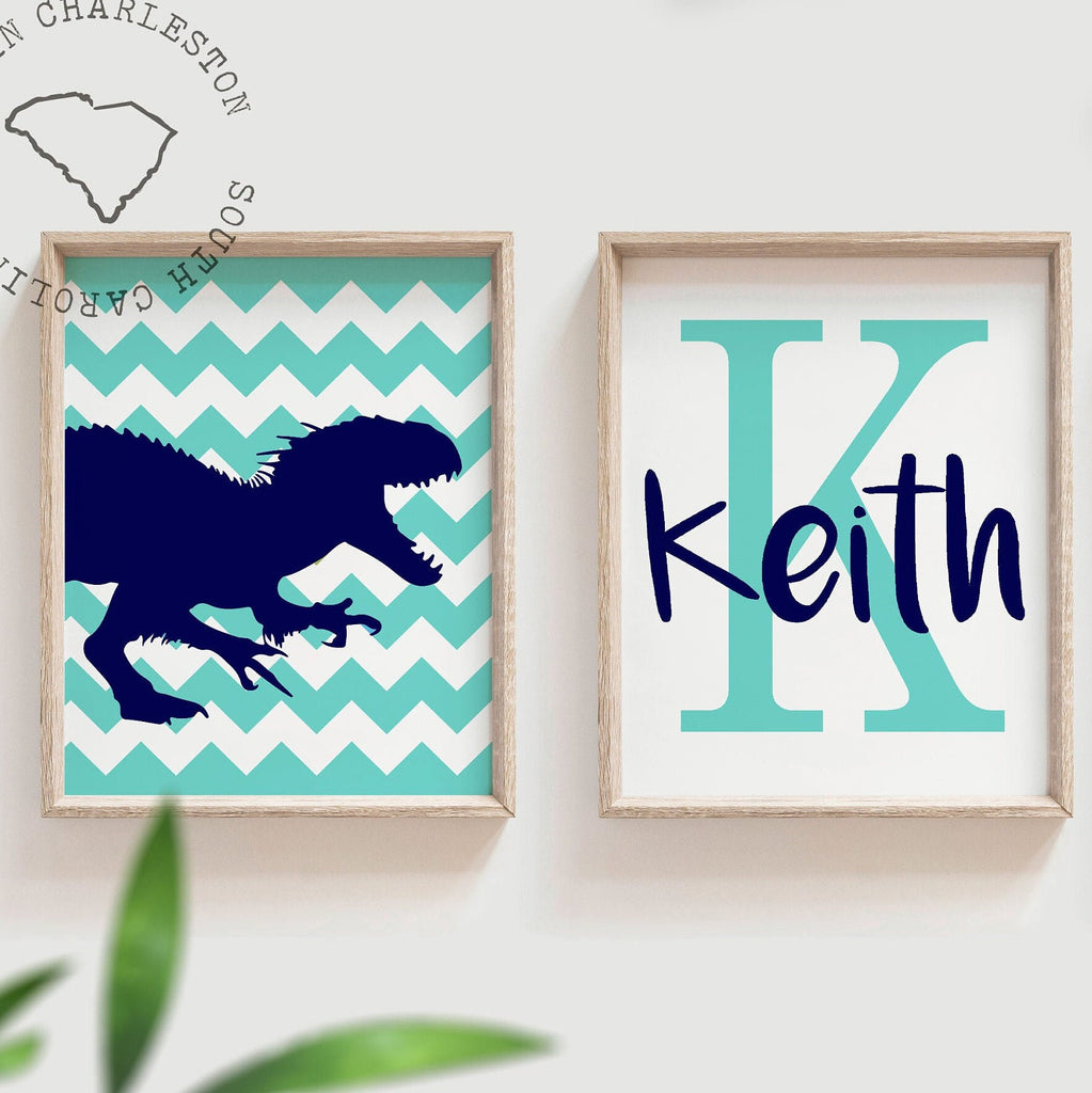 Product description: Dinosaur designs in aqua and navy blue. Matching print customized with your child's first initial and name. Other color options are also available in my shop.