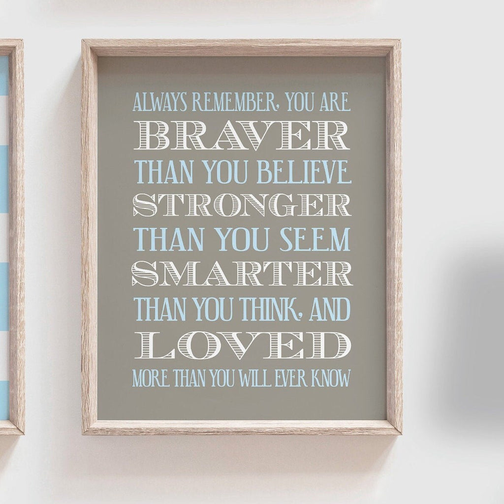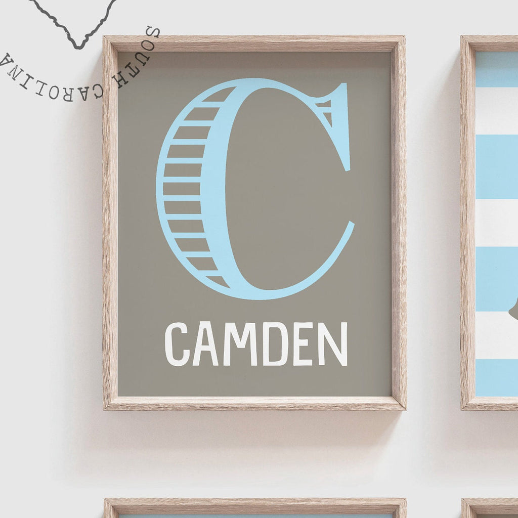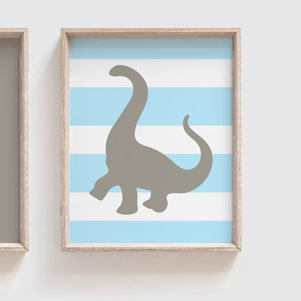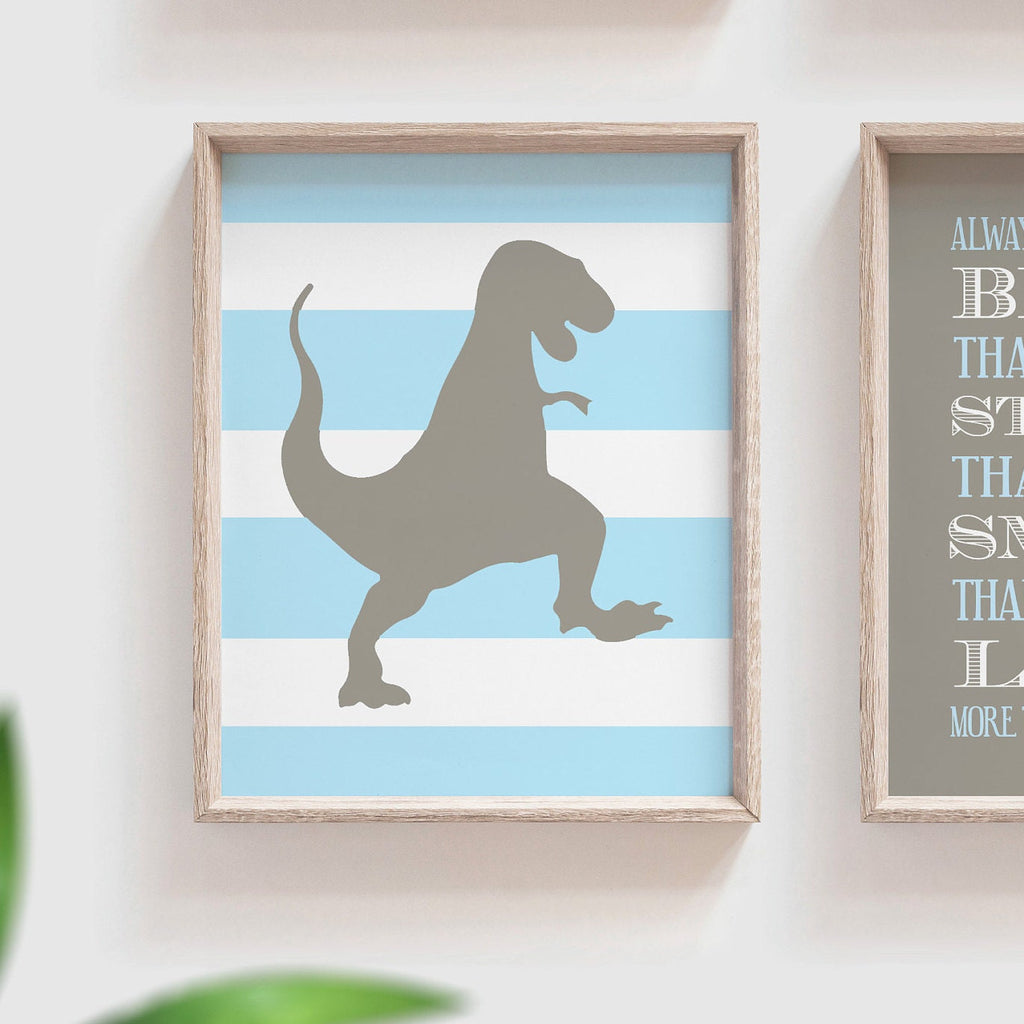 Product description: Dinosaur theme prints in baby blue and warm gray with striped backgrounds. Personalized name print and matching quote. Other color options are also available in my shop.