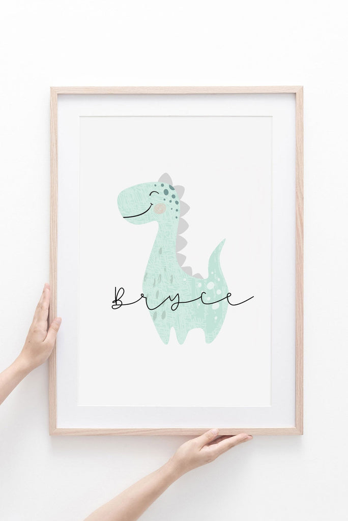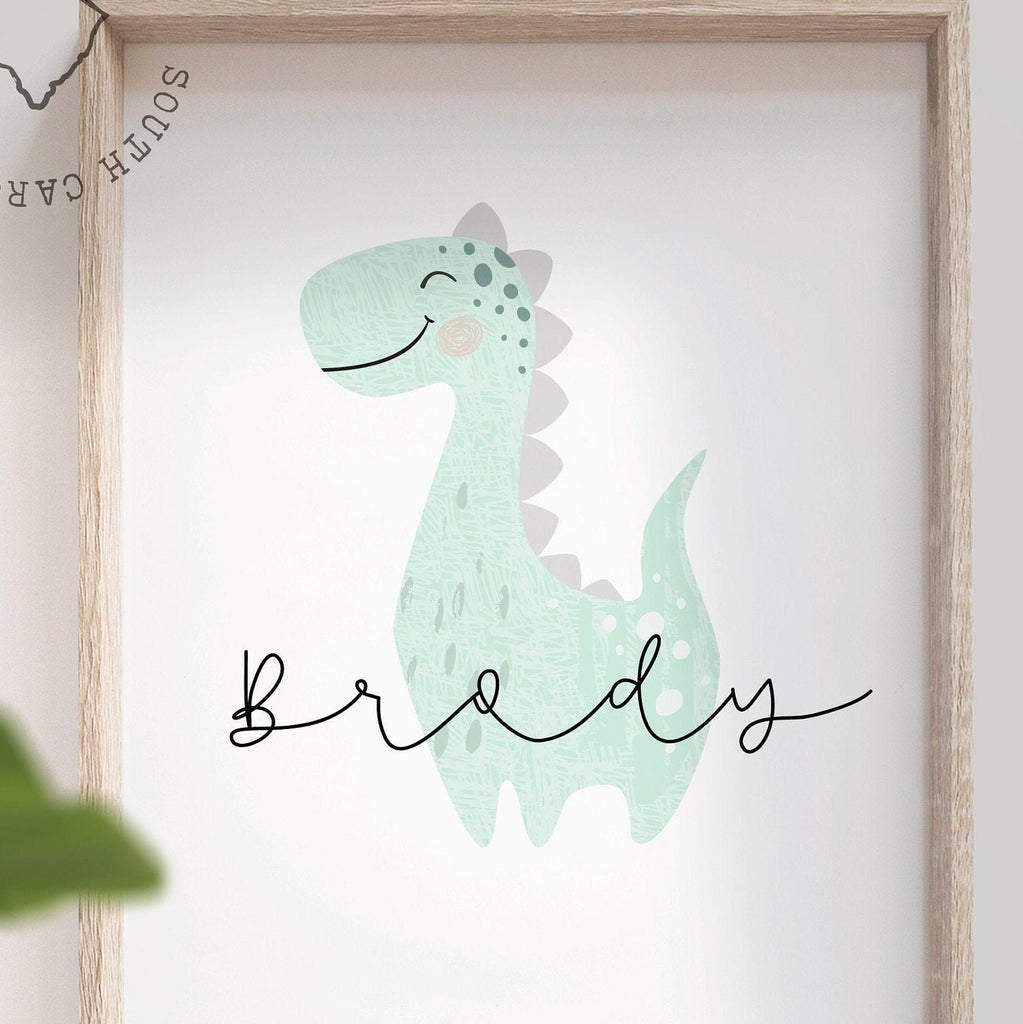Product description: Dinosaur themed print to be customized with your child's name in script. Additional options are also available in my shop.
