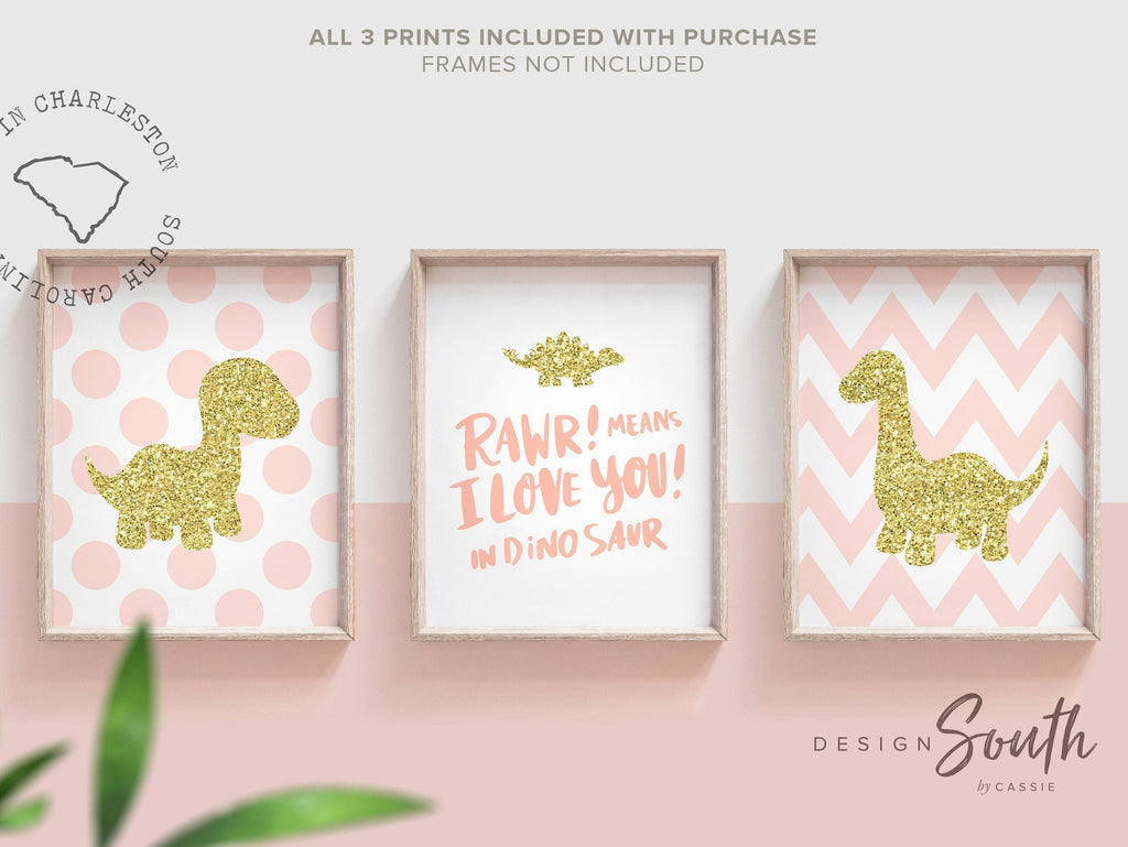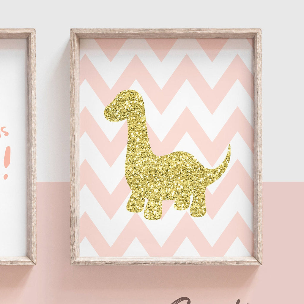 Baby girl dinosaur nursery, baby shower girl dinosaurs, blush pink gold sparkle dinosaur nursery, girl's room decor dinosaur wall art prints