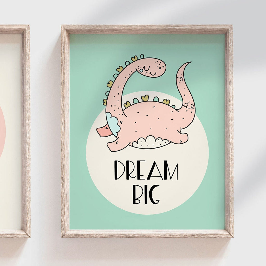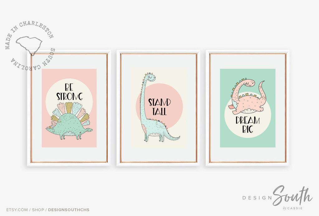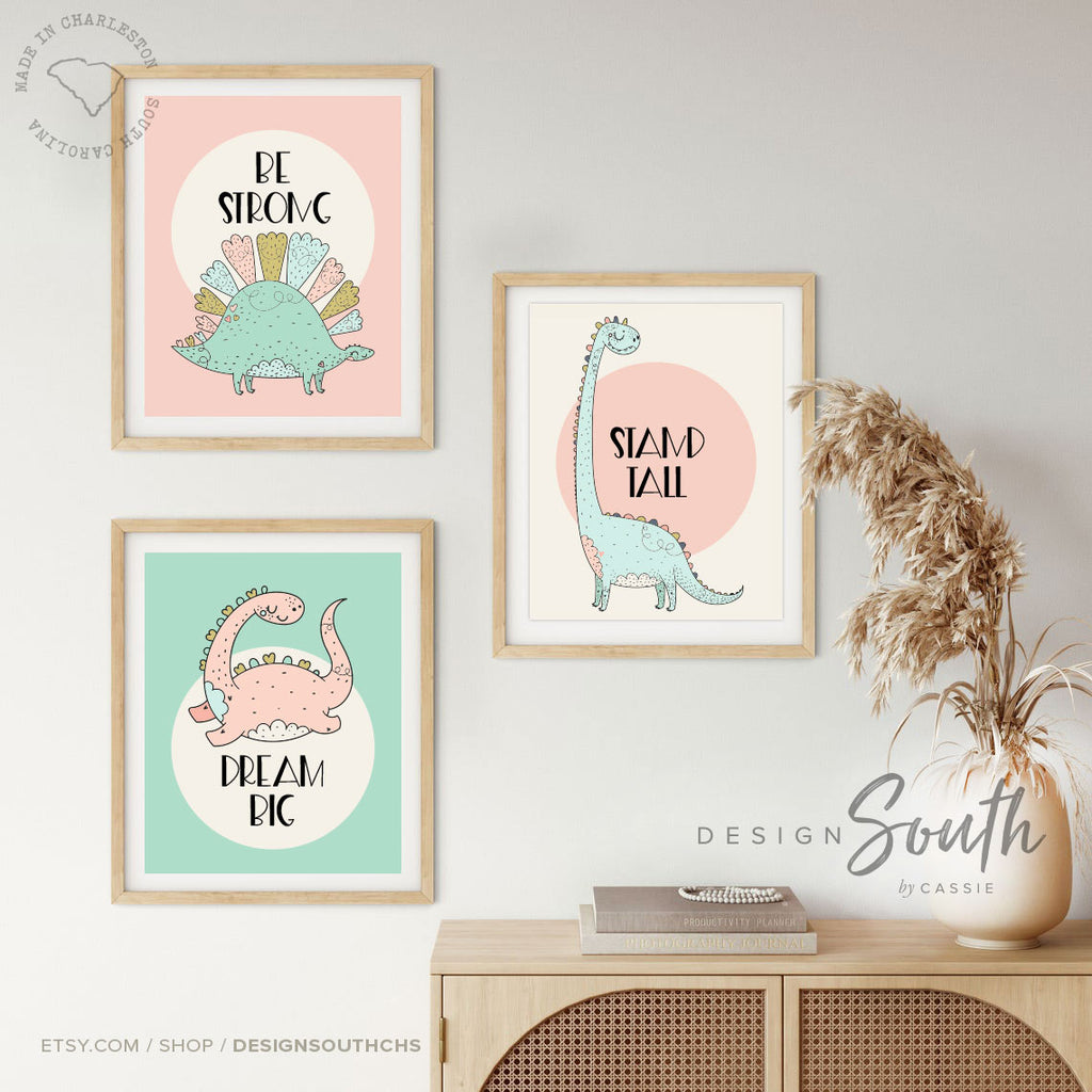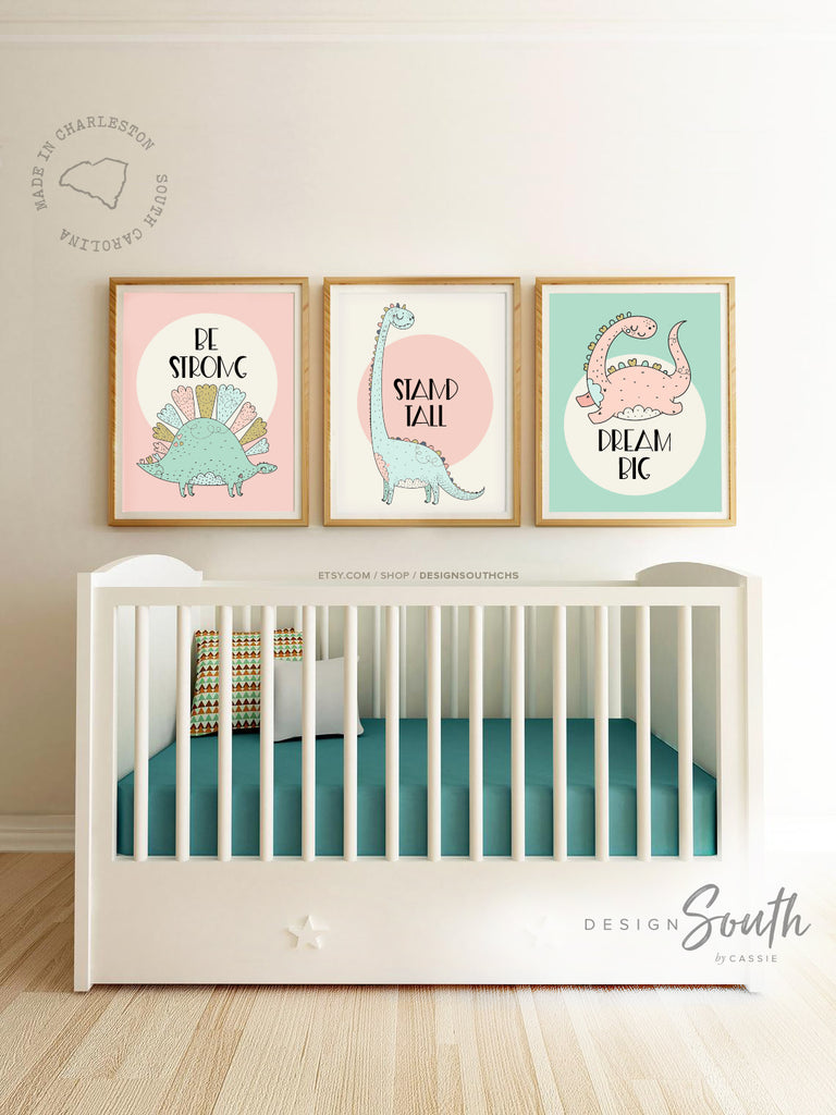Baby girl mint pink dinosaur decor, girl dinosaur nursery print set, shower girl dinosaur theme gift, sweet girl pink baby dinosaur gift art