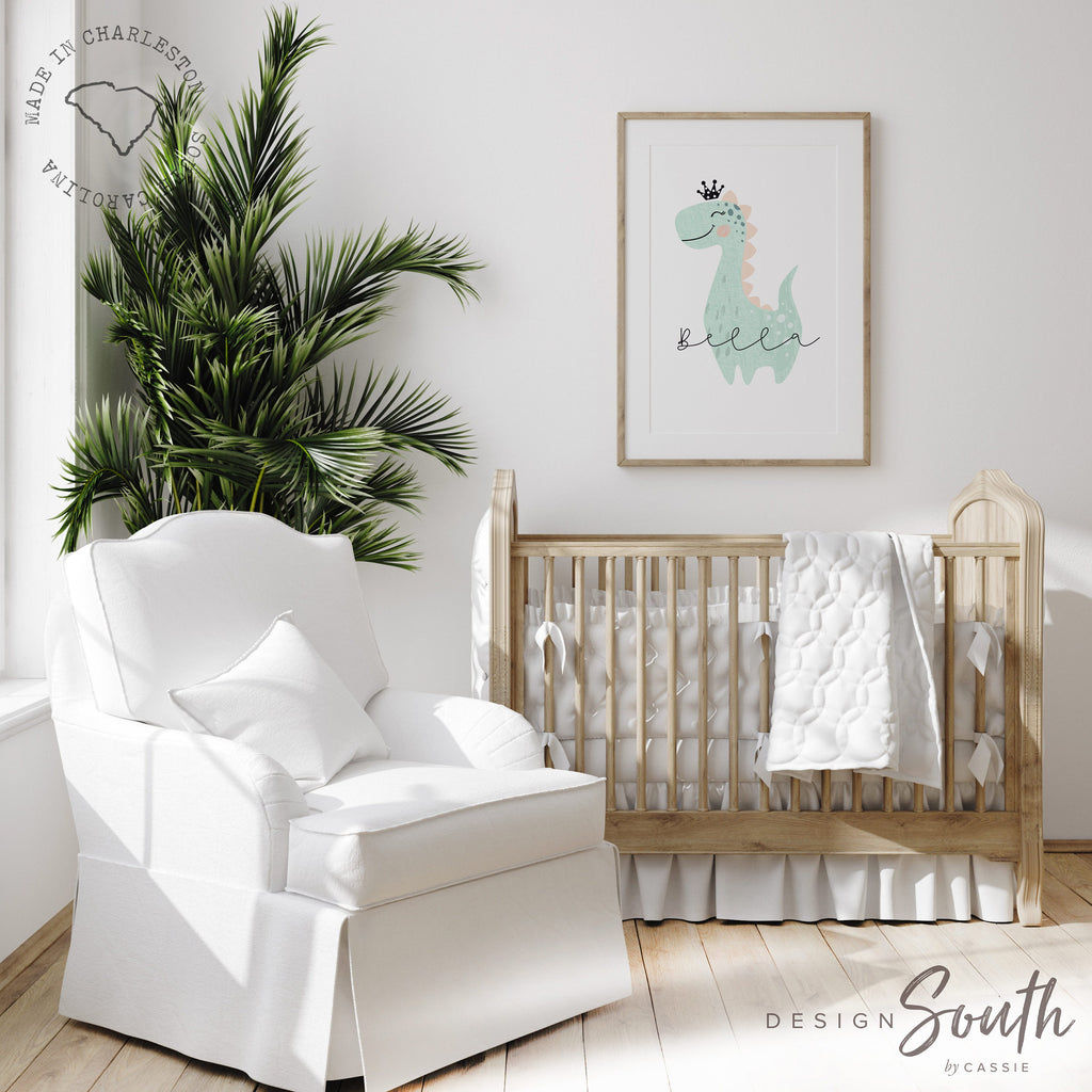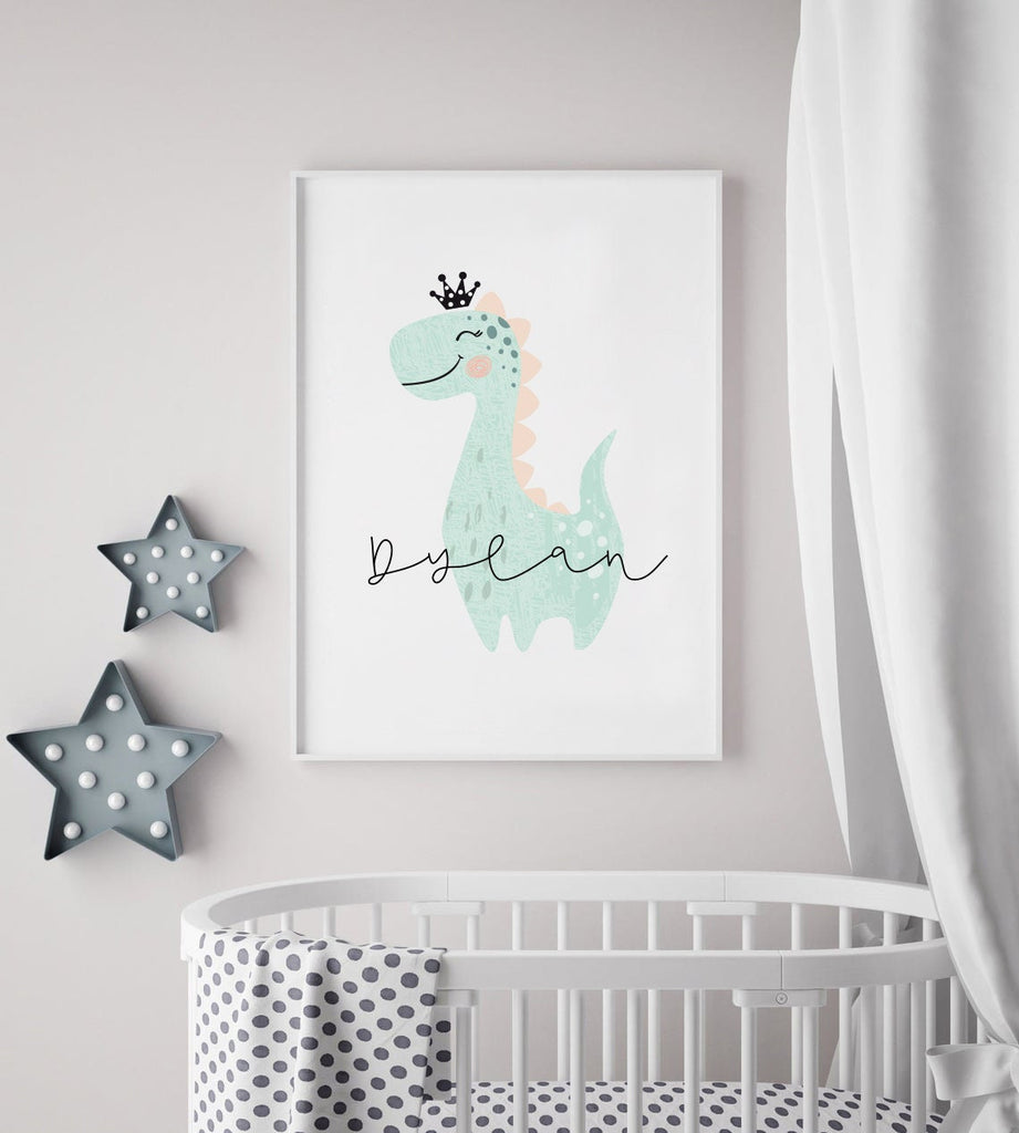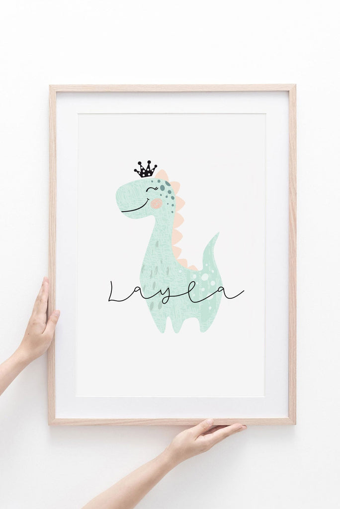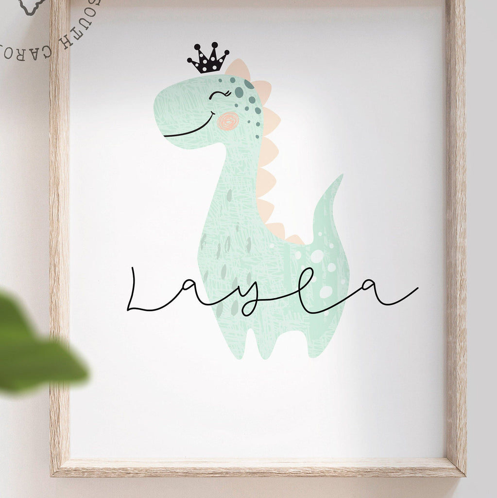 Baby girl mint princess dinosaur art, girl dinosaur nursery print personalized, shower girl dinosaur themed gift, sweet girl dinosaur gift