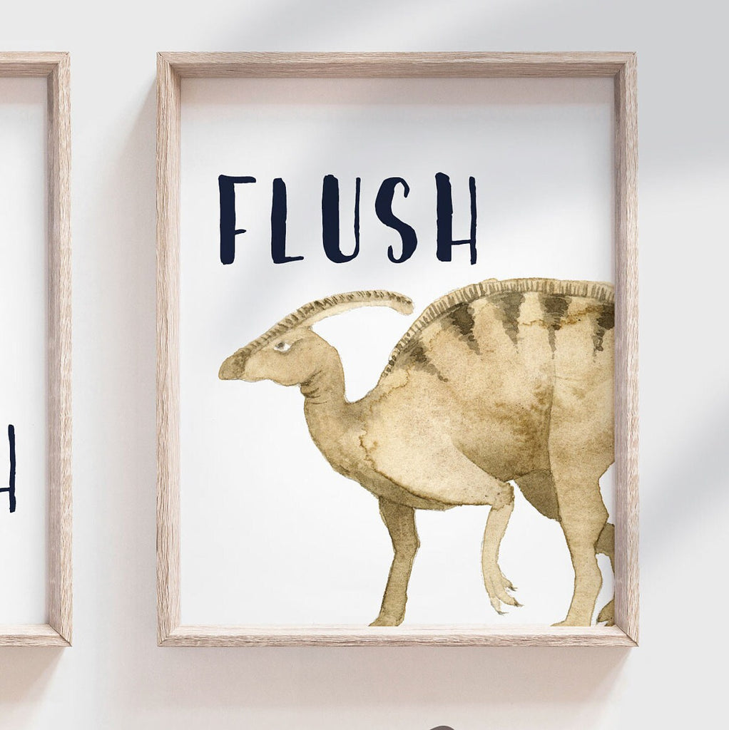 Product description: Watercolor dinosaur theme bathroom prints in neutral gray and beige colors with text reading, "Brush. Wash. Flush." Other options are also available in my shop.