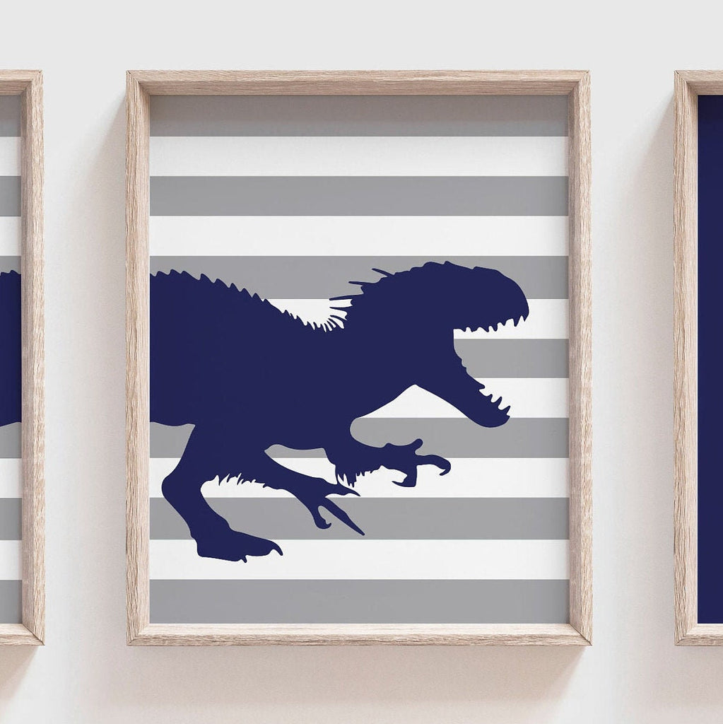 Product description: T-Rex Dinosaur in navy blue with smoke gray striped backgrounds. Matching quote reading: "Wash, Brush, Floss, Flush." Other color options available.