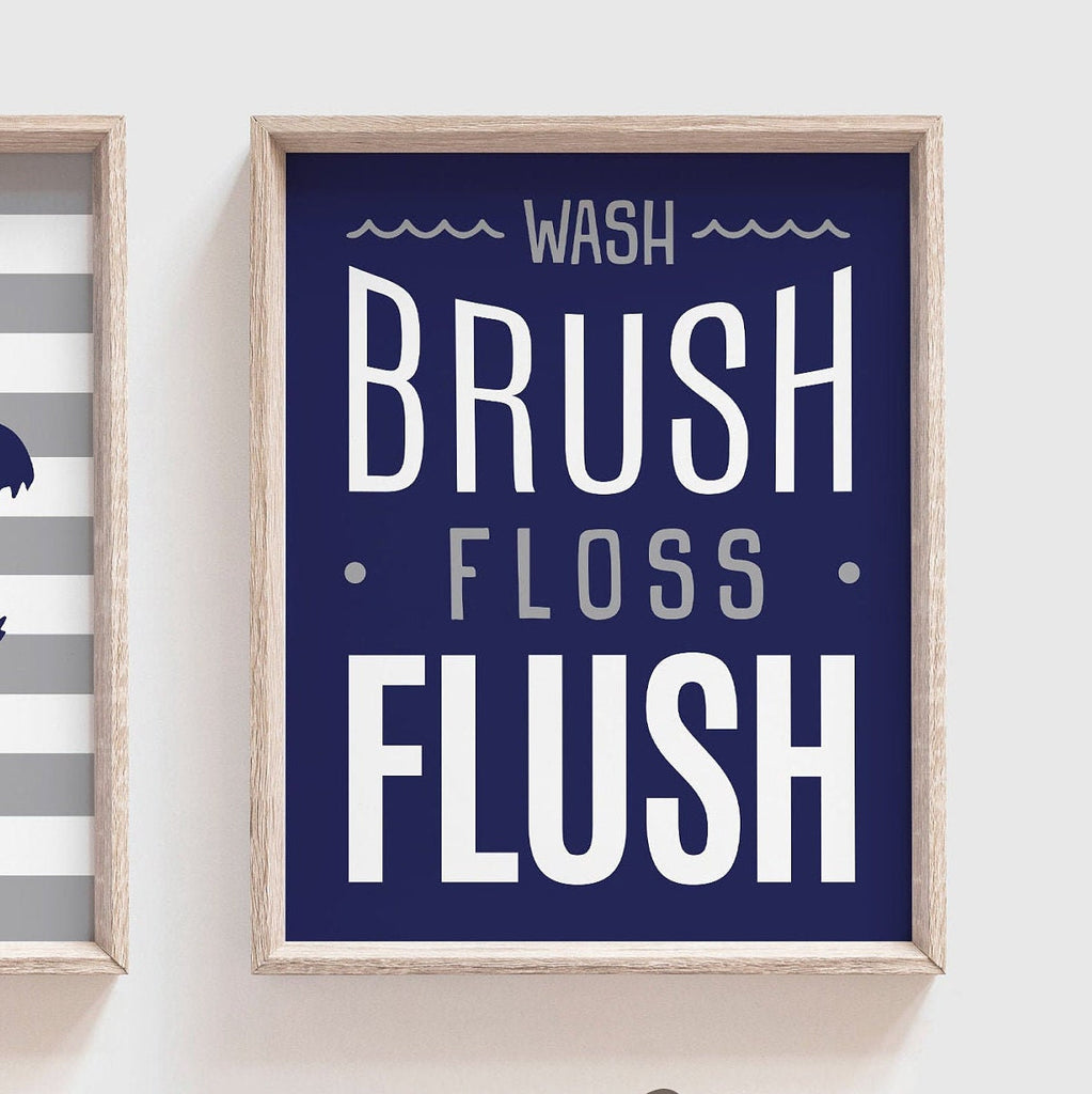 Boys bathroom navy blue and gray, boys blue and gray dinosaur prints, dinosaur bathroom theme, wash brush floss flush dinosaur, kid dinosaur