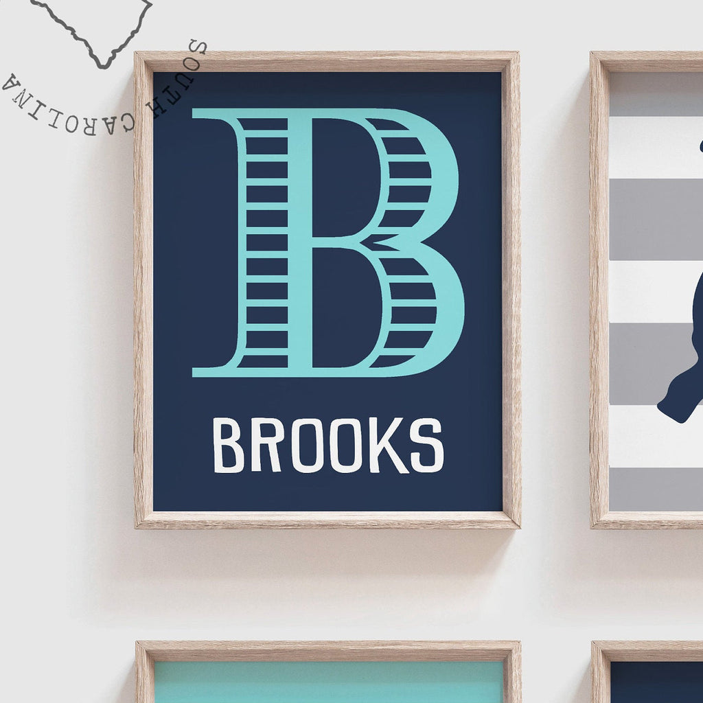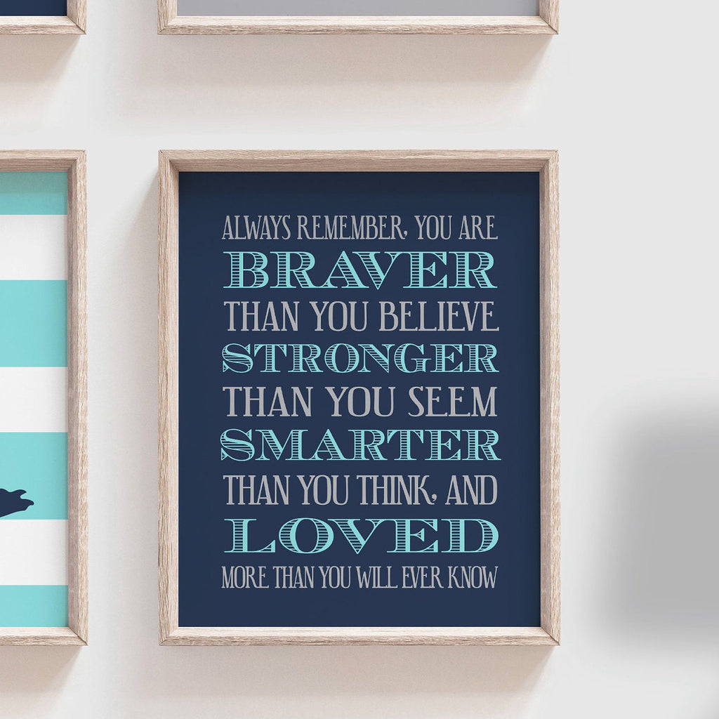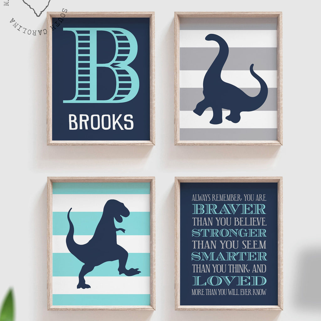 Product description: Dinosaur art prints in navy blue, light teal and smoke gray with striped backgrounds, matching personalized monogram and quote reading, "Always remember, you are braver than you believe, stronger than you seem, smarter than you think, and loved more than you know." Other options are also available in my shop.
