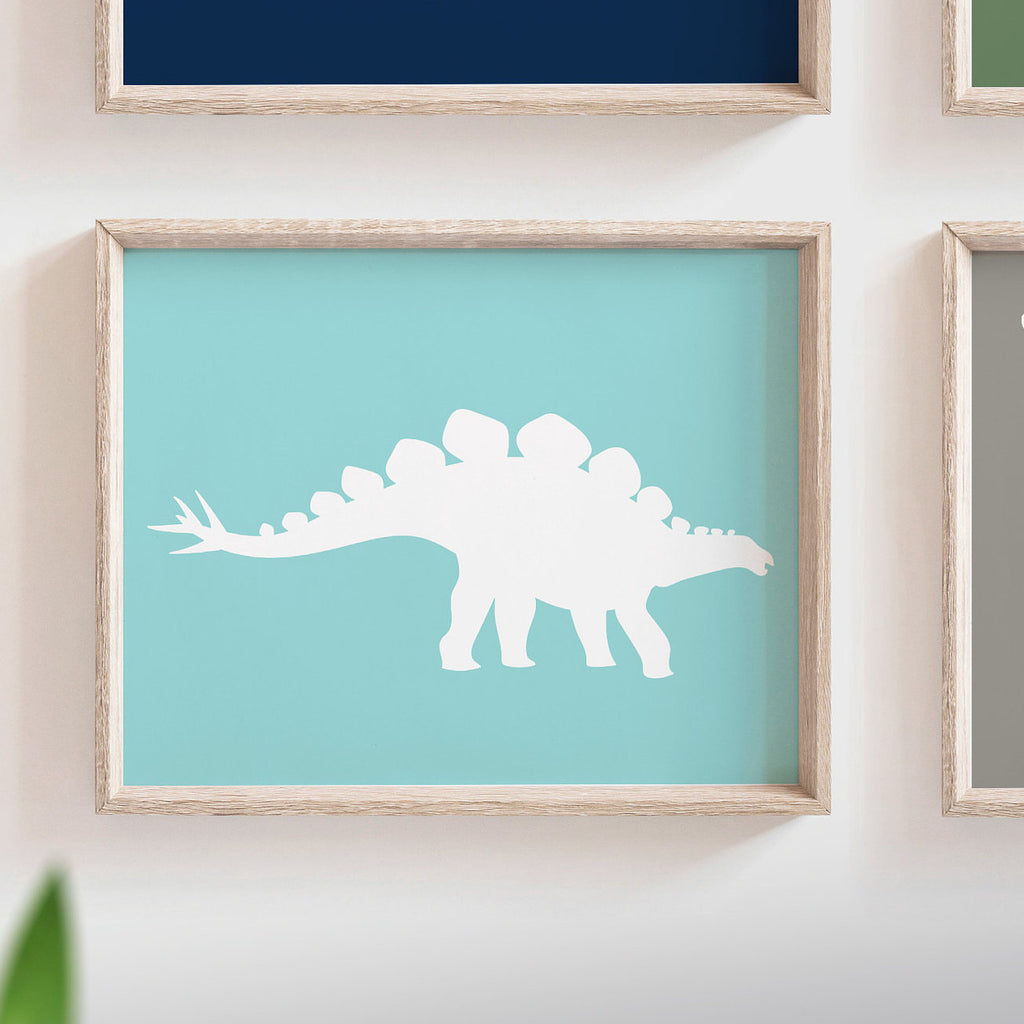 Product description: Dinosaur art prints in white with background colors in navy blue, smoke gray, clover and ocean blue. Other options are also available in my shop.