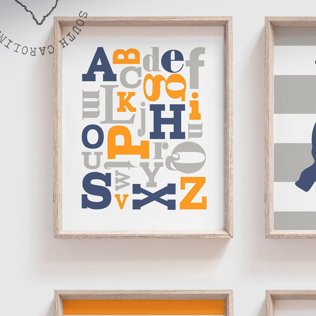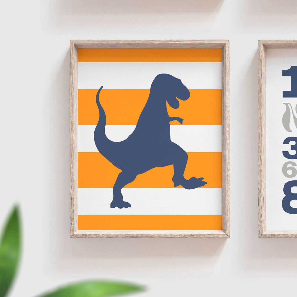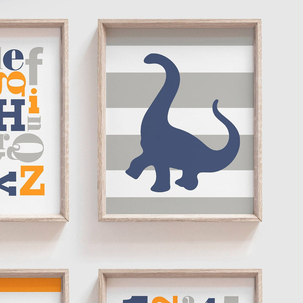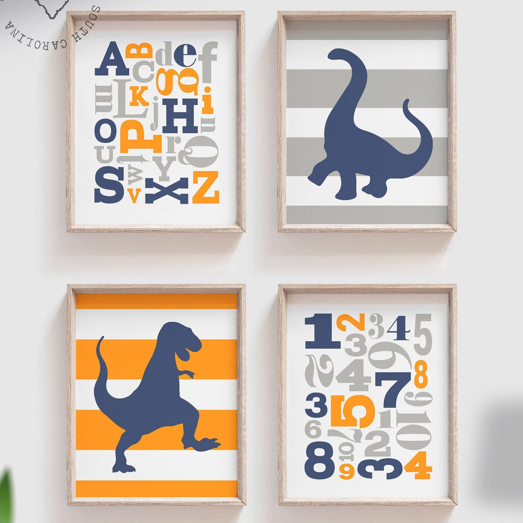 Dinosaur nursery decor orange and navy blue, kids prints, dinosaur wall art, dinosaur kids abc gift, orange and blue wall art boy, abc 123