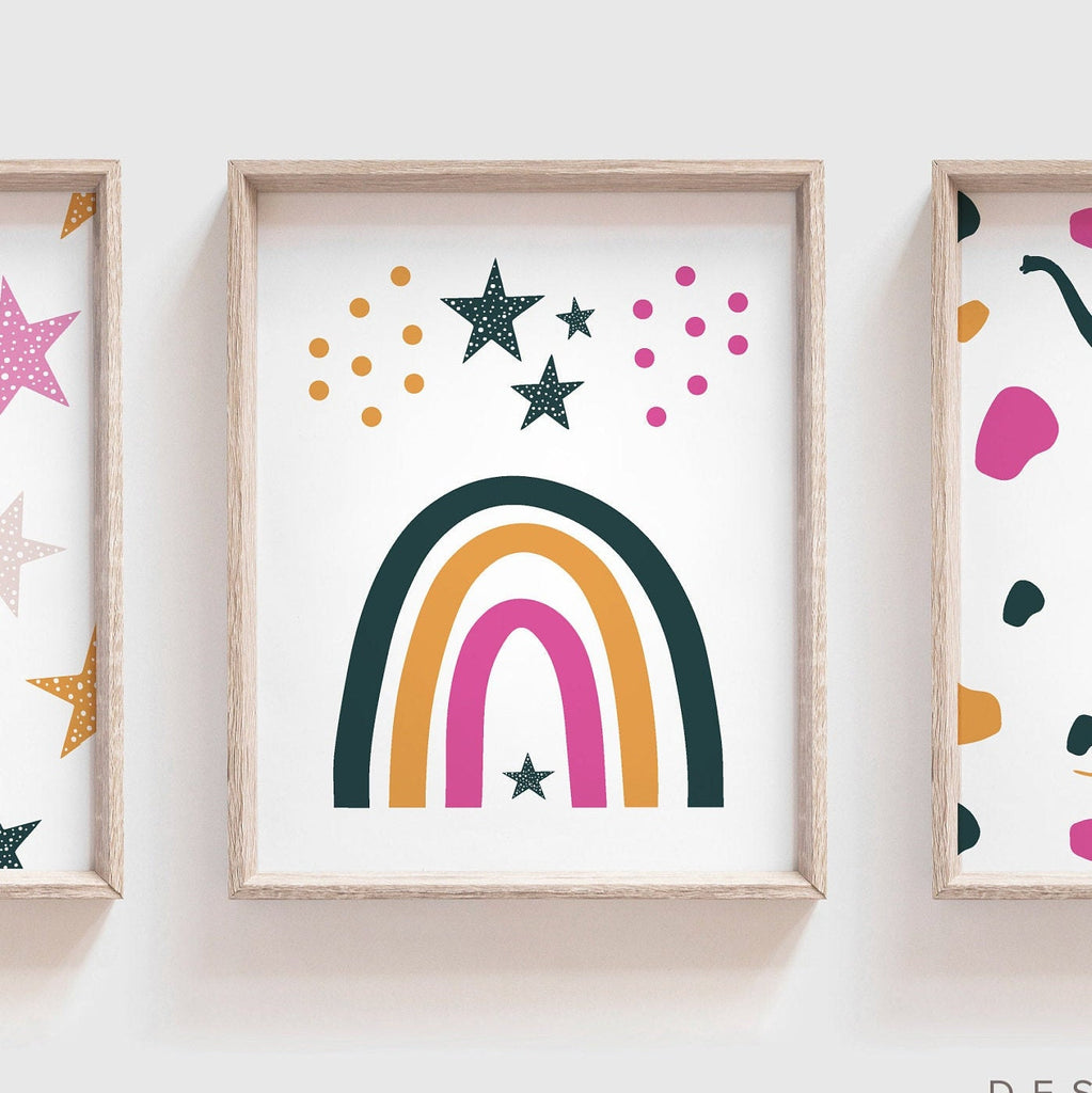 Product description: Art prints featuring dinosaurs, stars terrazzo patterns and a rainbow. Other options are also available in my shop.