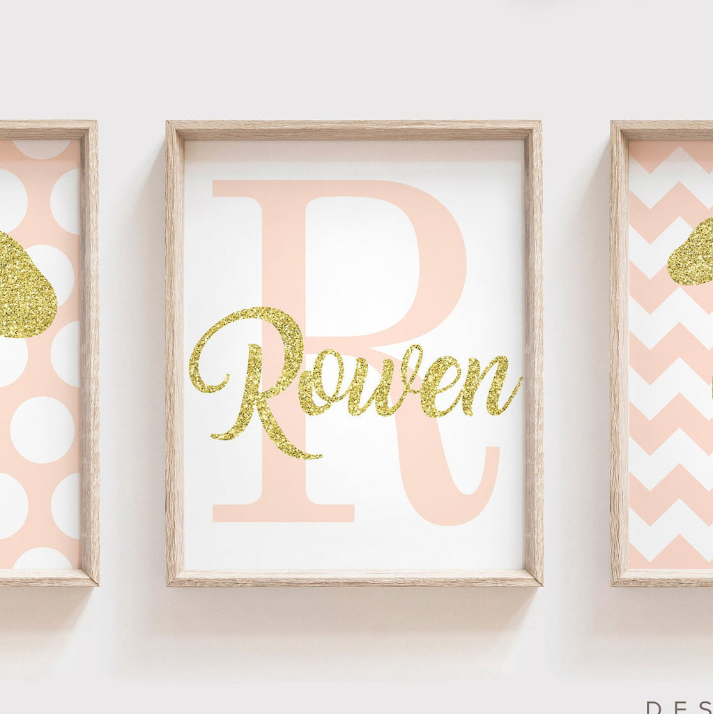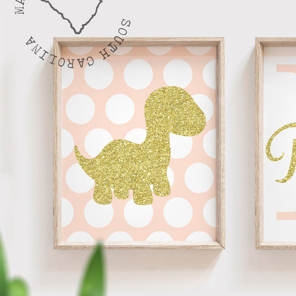 Product description: Cute baby dinosaur designs in blush, peach and gold sparkles. Matching print customized with your child's first initial and name. Other color options available. Note: The item listed is created digitally. Gold glitter nor sparkly paper was used in creating the design. High resolution photography of sparkles was used to create a 3D appearance of sparkles.