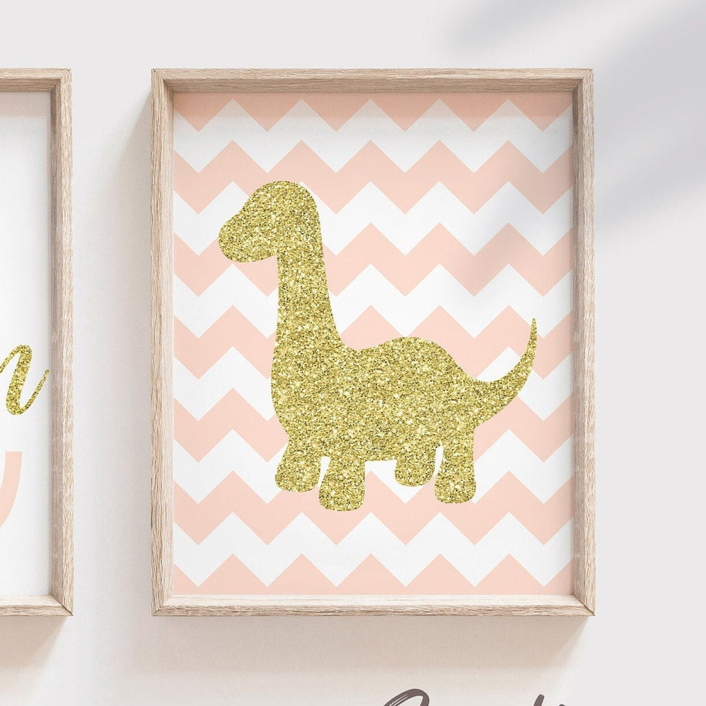Girls pink gold dinosaur art, girls personalized dinosaur room wall art, dinosaur nursery for baby girl, pink dinosaur bedroom wall decor