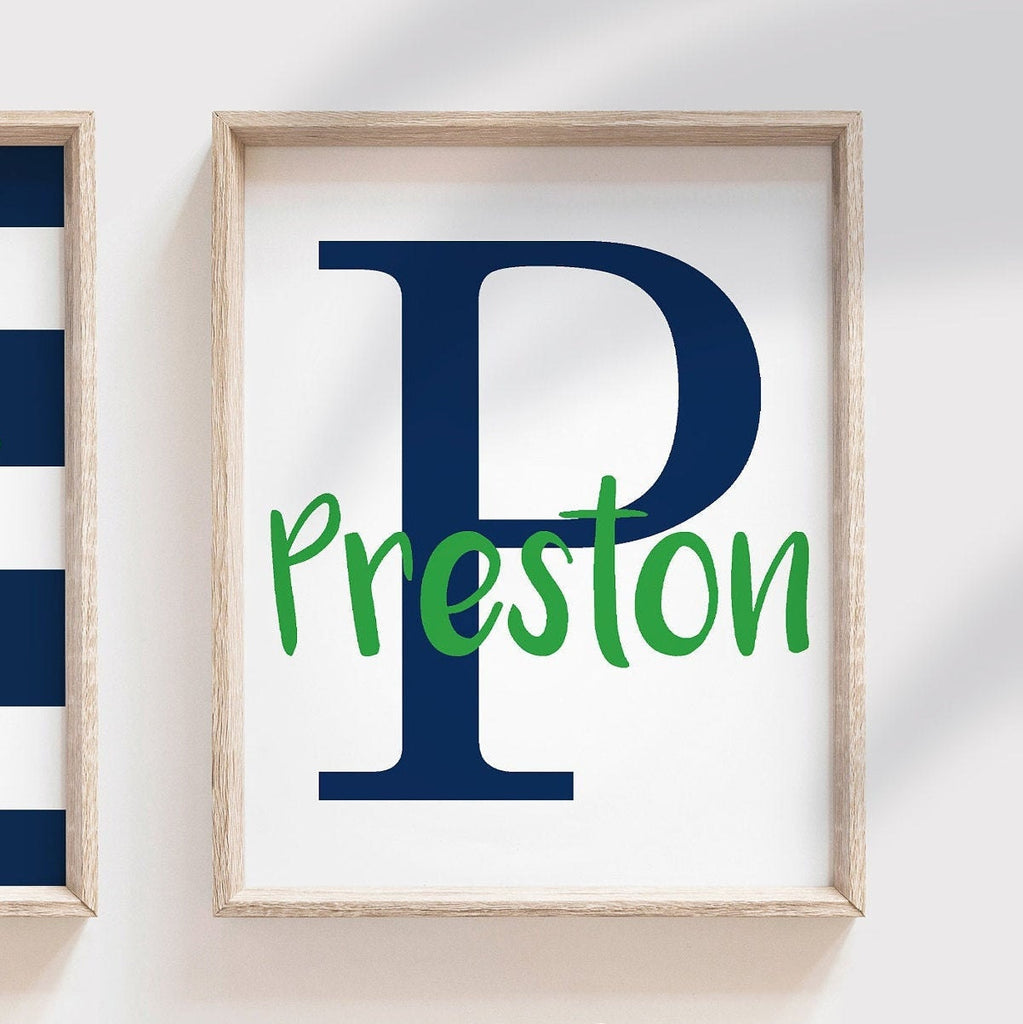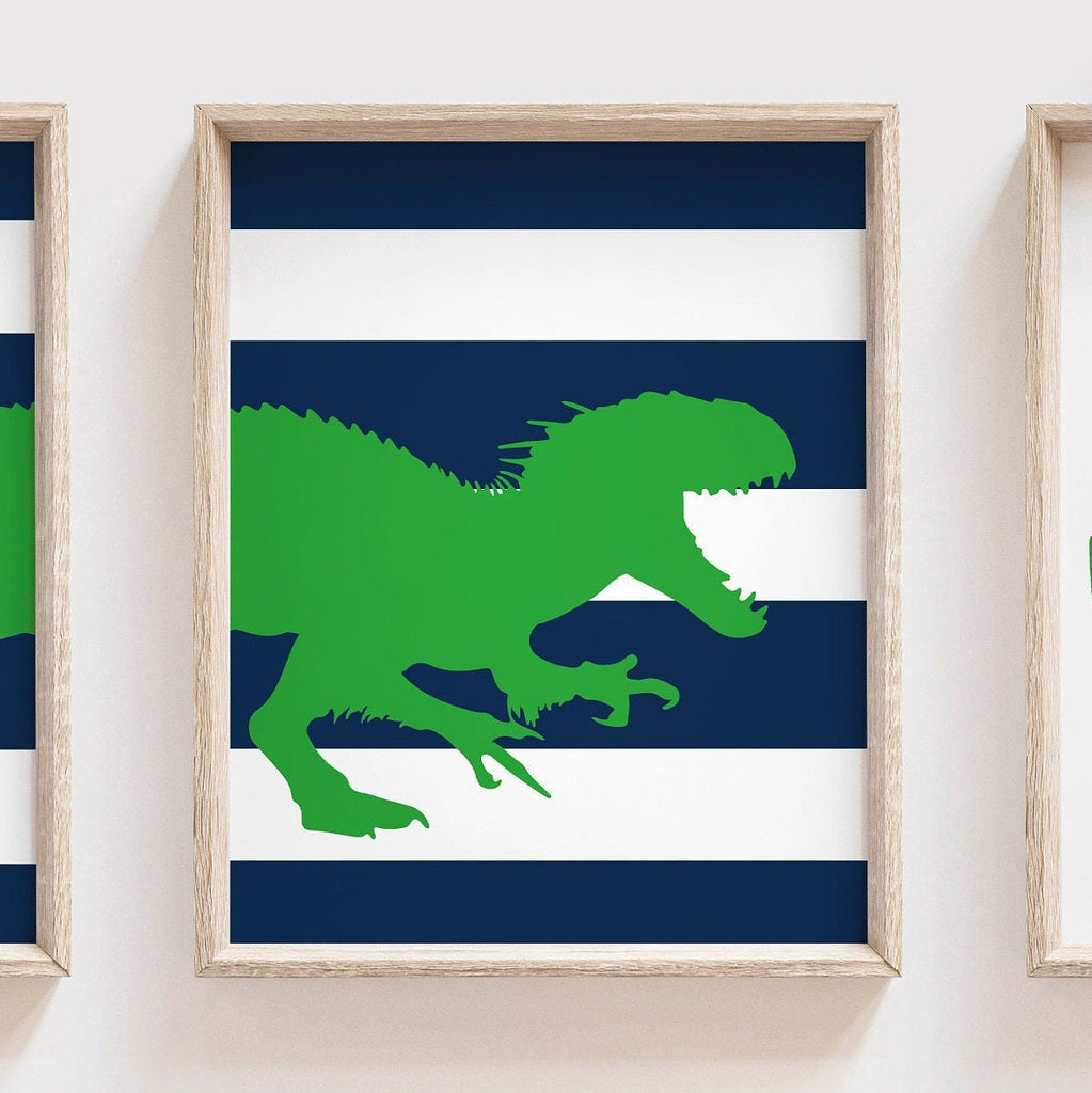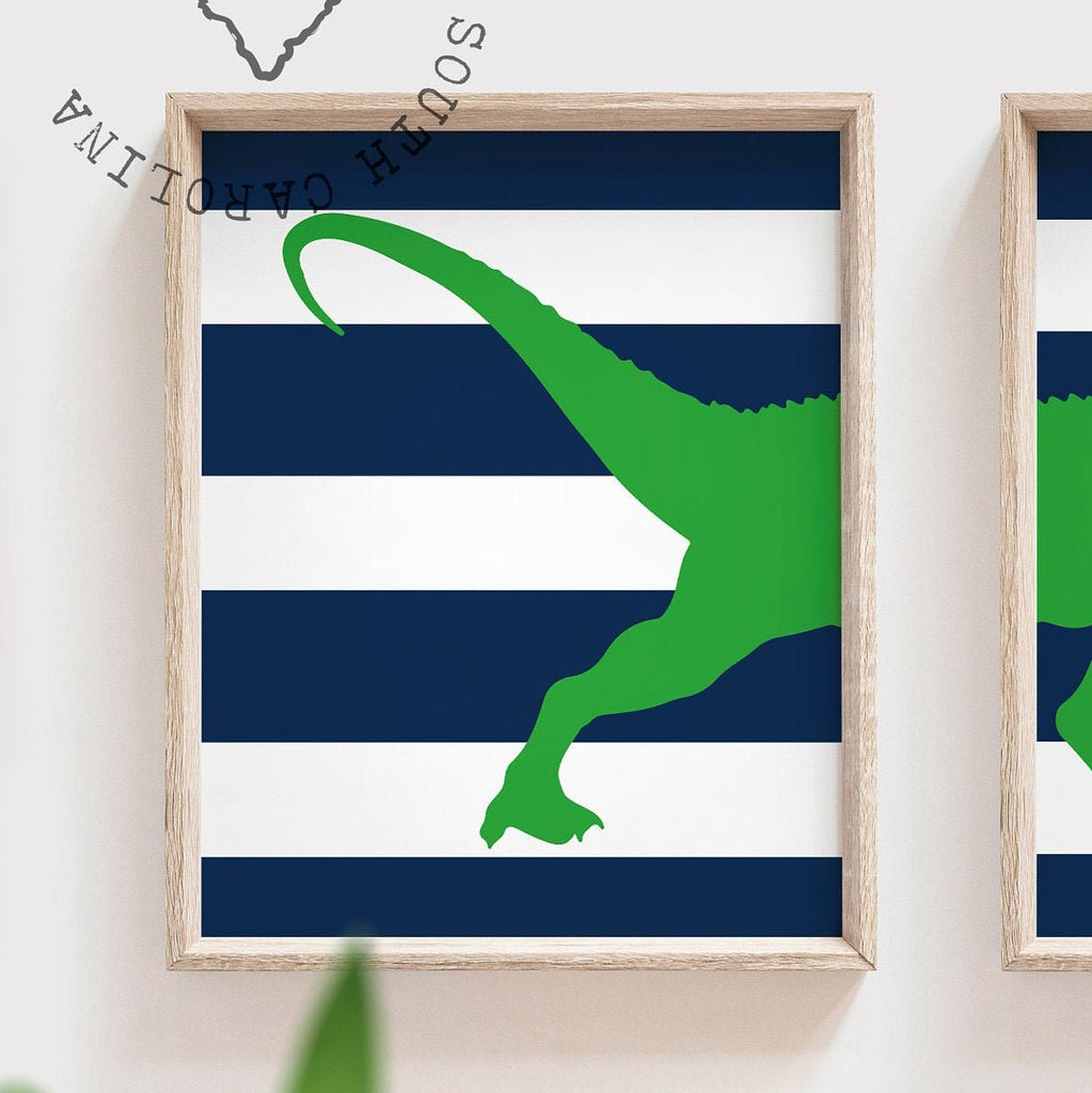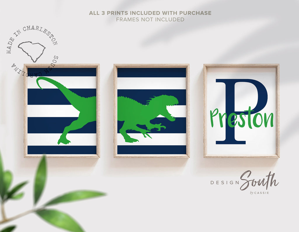 Product description: Tyrannosaurus Rex theme prints in navy blue and grass green with striped backgrounds. Matching name print personalized with your child's name and initial. Other color options are also available.