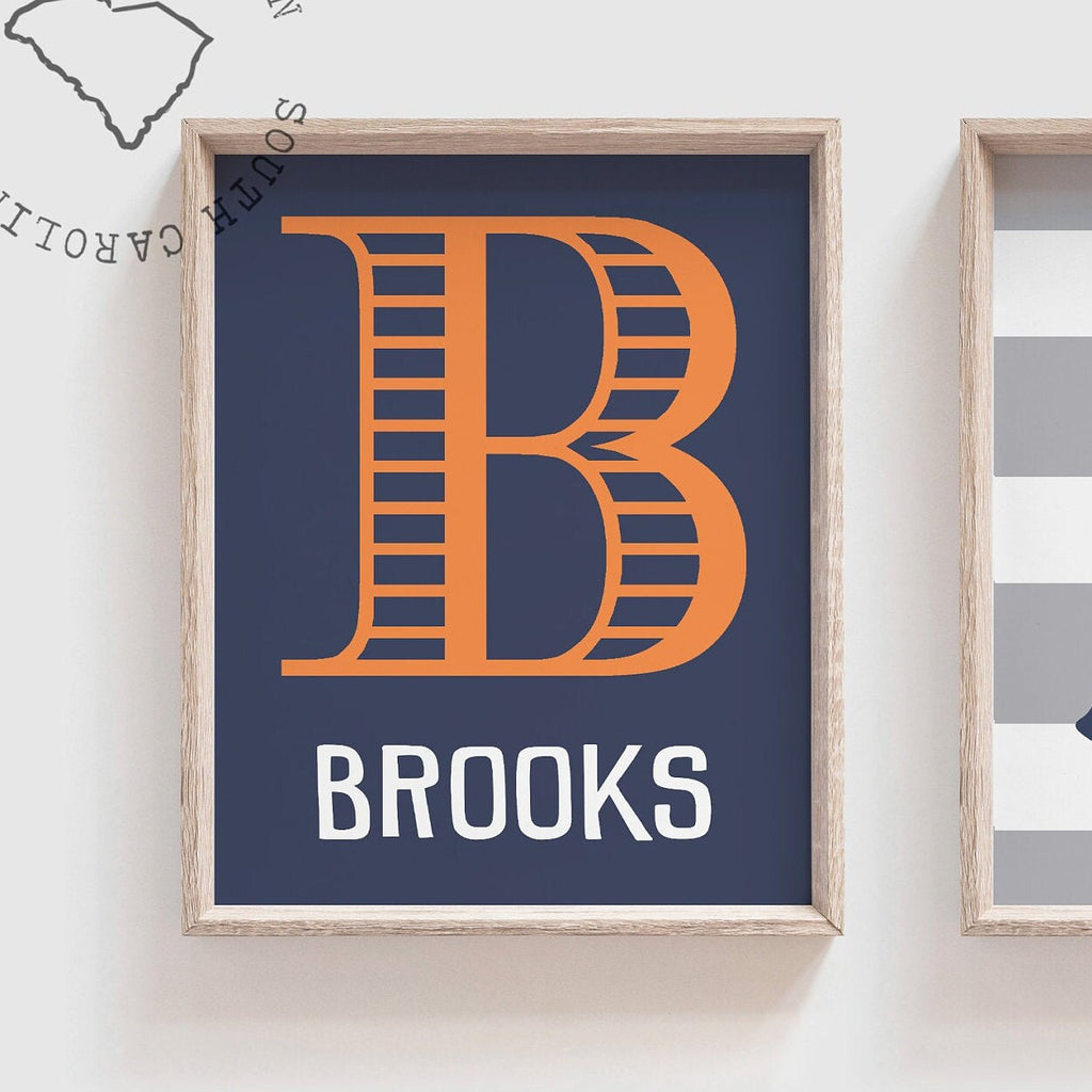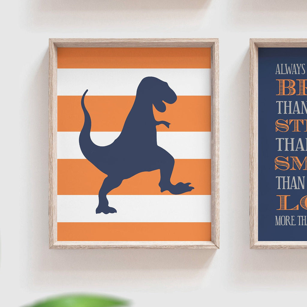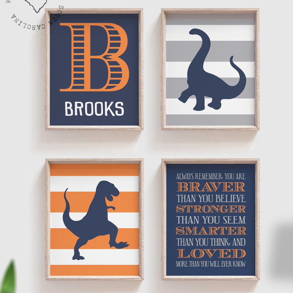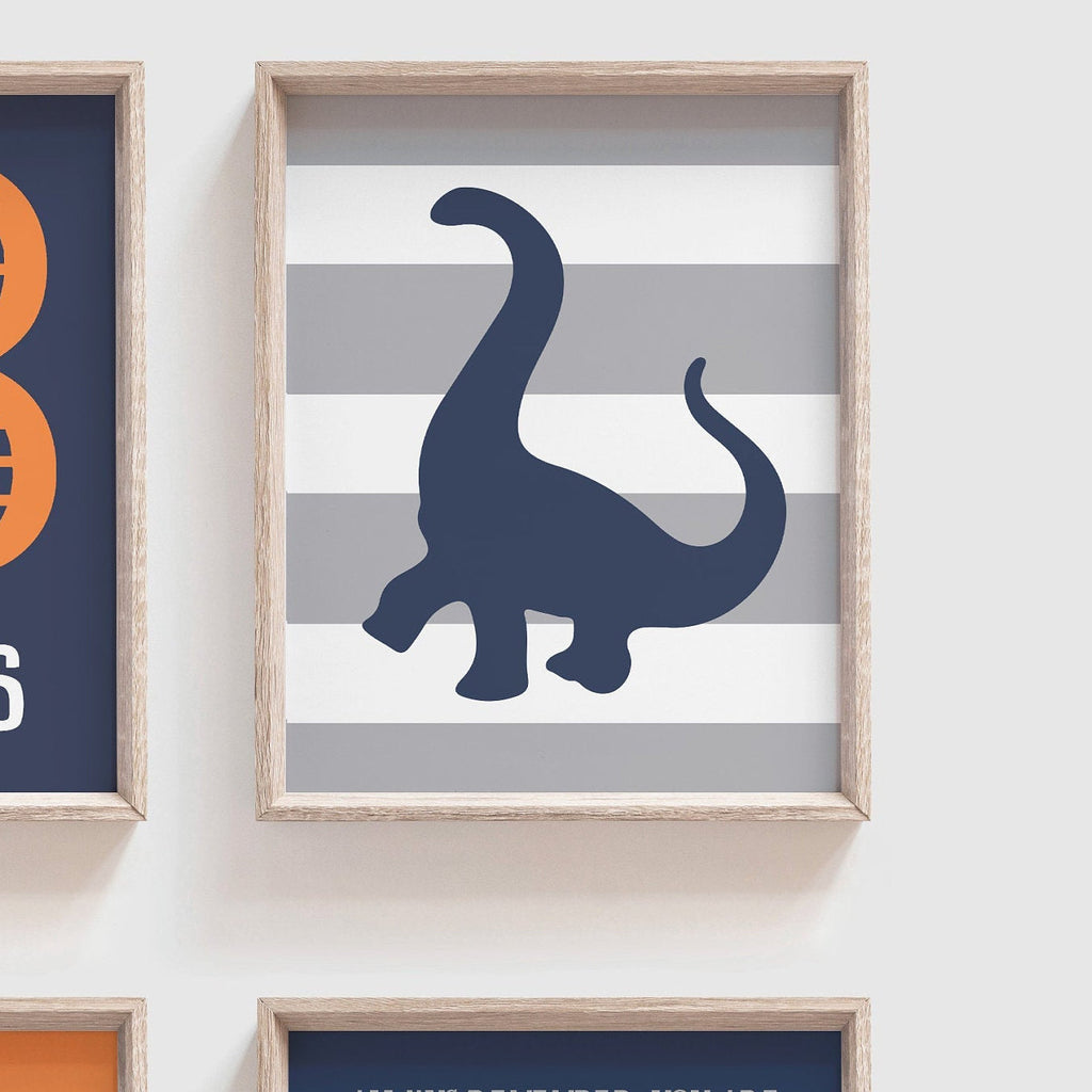 Product description: Dinosaur theme prints in orange, gray and soft navy blue. Personalized name print and matching quote. Other color options are also available.