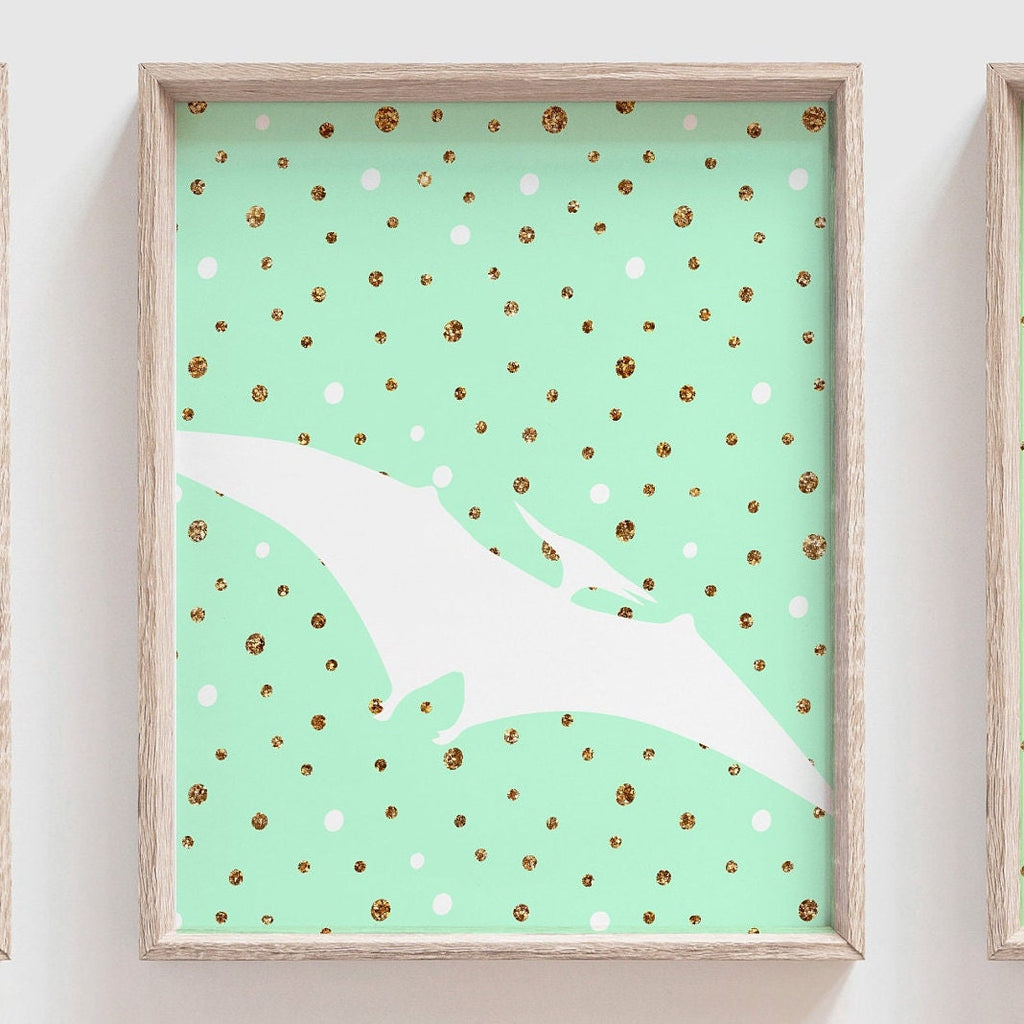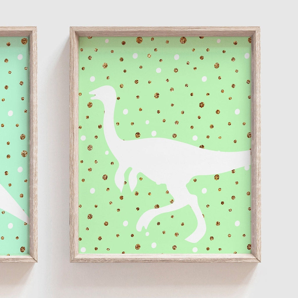 Product description: Art prints featuring dinosaur silhouettes in white against pastel colored digital paper with faux gold and white sparkled dots. Other options are also available in my shop.