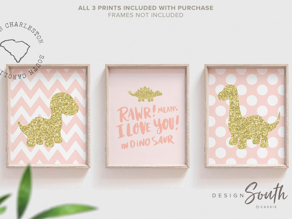 Product description: Dinosaur designs in gold sparkle and backgrounds in cupcake pink with polka dots and chevron. Quote lettering in ballet pink reading, "Rawr! means I love you! in dinosaur." Note: The item listed is created digitally. Gold glitter nor sparkly paper was used in creating the design. High resolution photography of sparkles was used to create a 3D appearance of sparkles. Other options are also available in my shop.